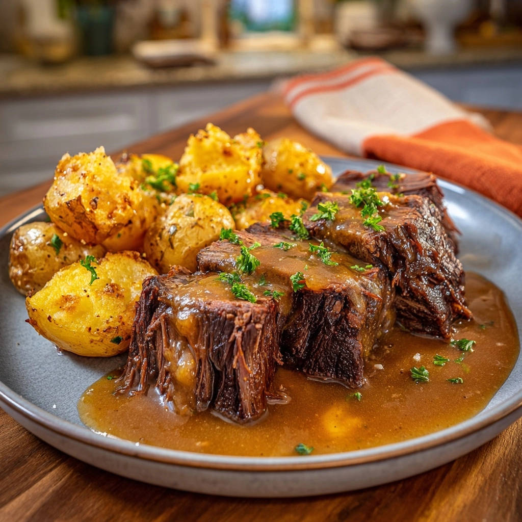 Deftiger Schmorbraten mit Rosmarin-Knusperkartoffeln