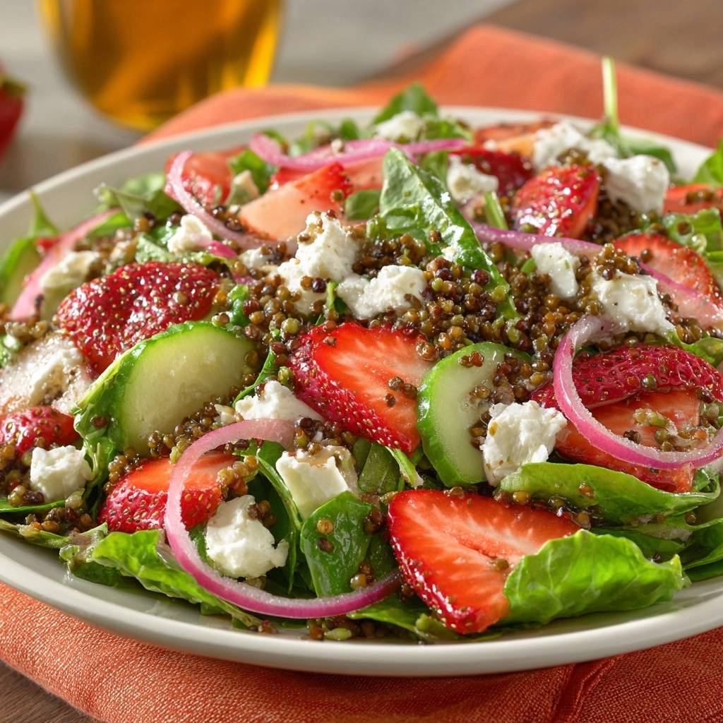 Frische Erdbeeren bringen natürliche Süße, die perfekt mit dem säuerlichen Dressing harmoniert. Nimm reife, aber feste Früchte.