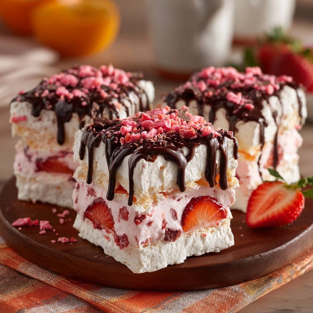 Bestreue die noch feuchte Schokolade sofort mit dem Erdbeerkrokant. Stell die Schnitten für mindestens 2 Stunden kalt, damit die Creme fest wird und sich die Aromen verbinden.