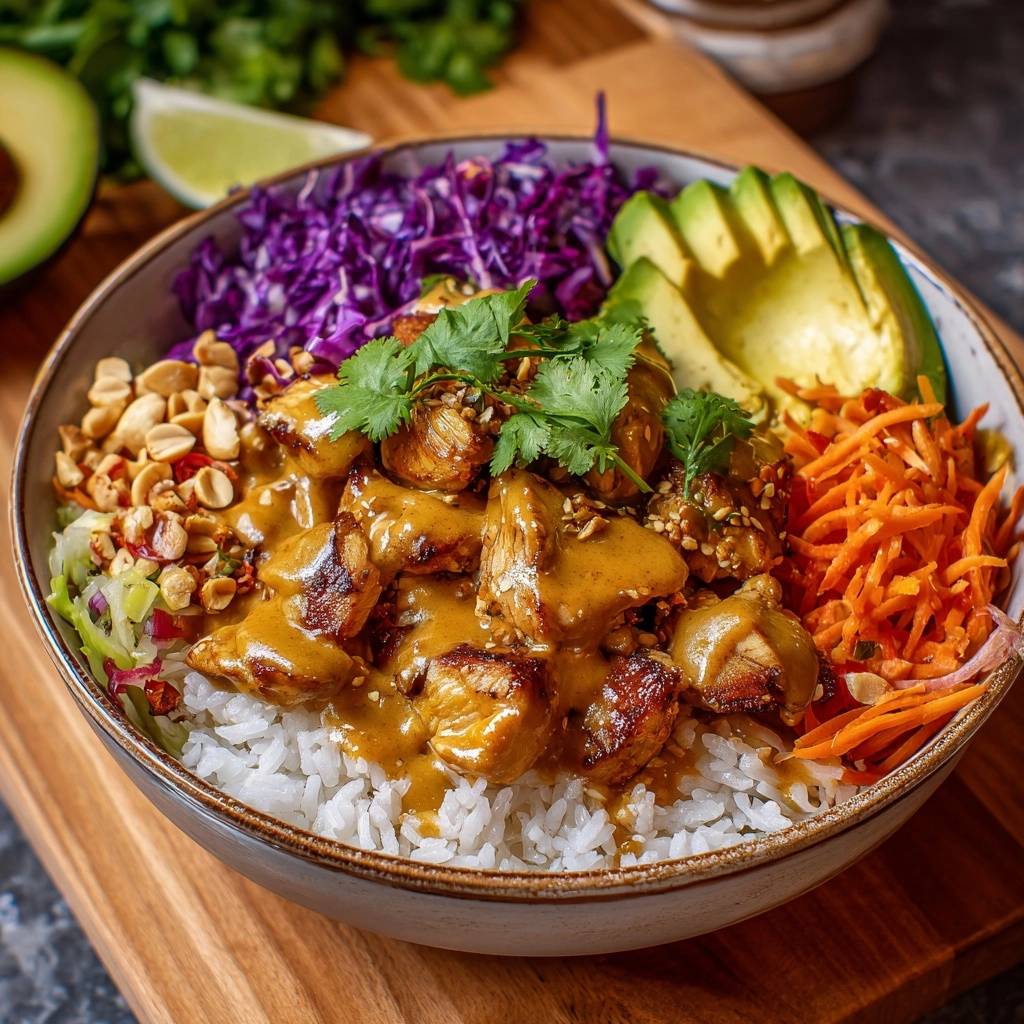 - Bowl zusammenstellen: Reis in Schalen verteilen, Hähnchen mit Soße darauf, Avocado, Karotten, Rotkohl, Koriander und Erdnüsse toppen. Sofort servieren.