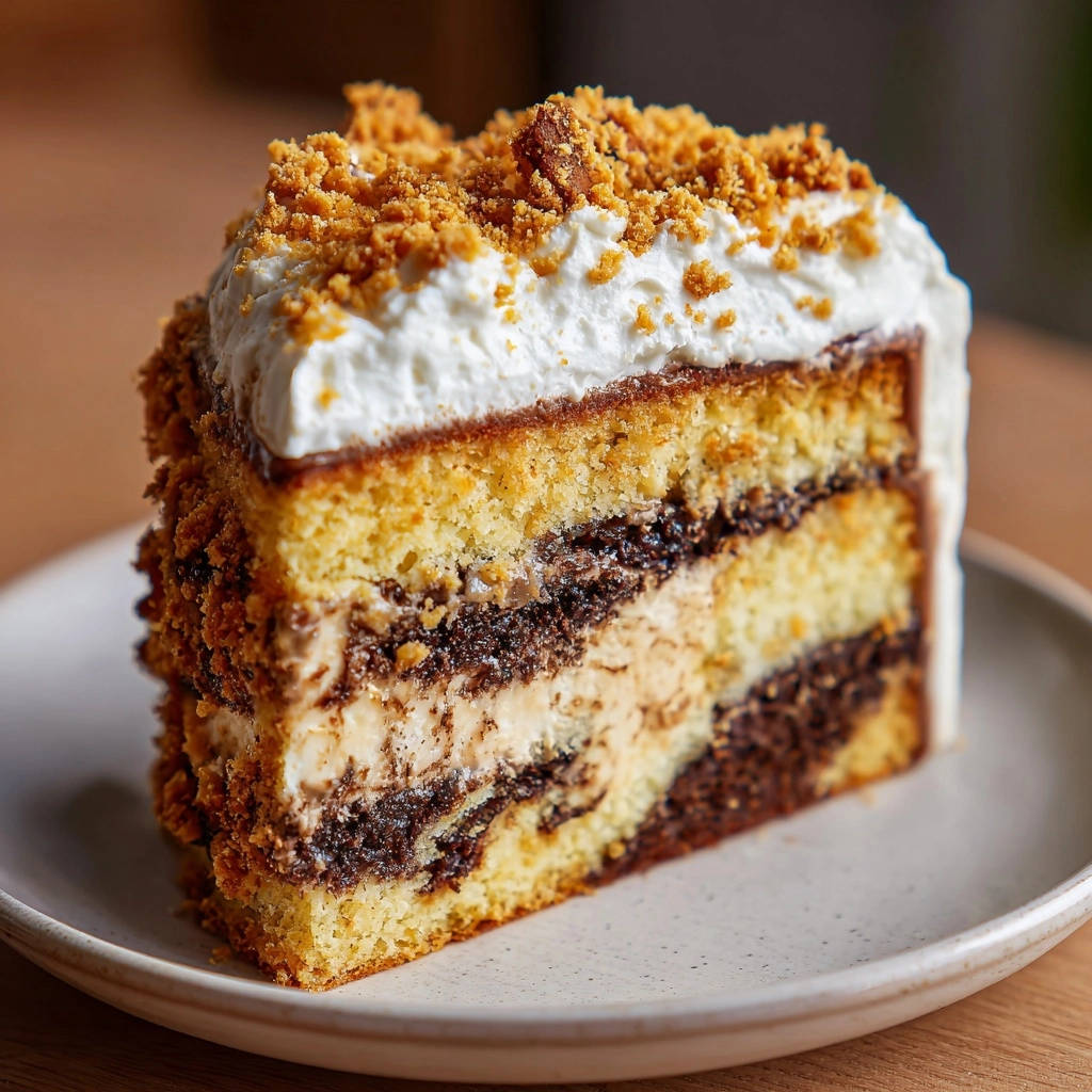 - Torte schichten und fertigstellen: Legen Sie den ersten getränkten Kuchenboden auf eine Servierplatte. Bestreichen Sie ihn mit der Hälfte der Mascarpone-Creme. Darauf verteilen Sie die Hälfte der Schoko-Crumble-Füllung. Legen Sie den zweiten Kuchenboden darauf und wiederholen Sie den Vorgang mit der restlichen Mascarpone-Creme und dem Schoko-Crumble. Setzen Sie den letzten Kuchenboden auf. Schlagen Sie für die äußere Hülle die restliche Sahne mit Sahnesteif und Puderzucker steif. Bestreichen Sie die gesamte Torte mit der Sahne. Drücken Sie die karamellisierten Keksstreusel vorsichtig an den Seiten und auf der Oberfläche der Torte fest.