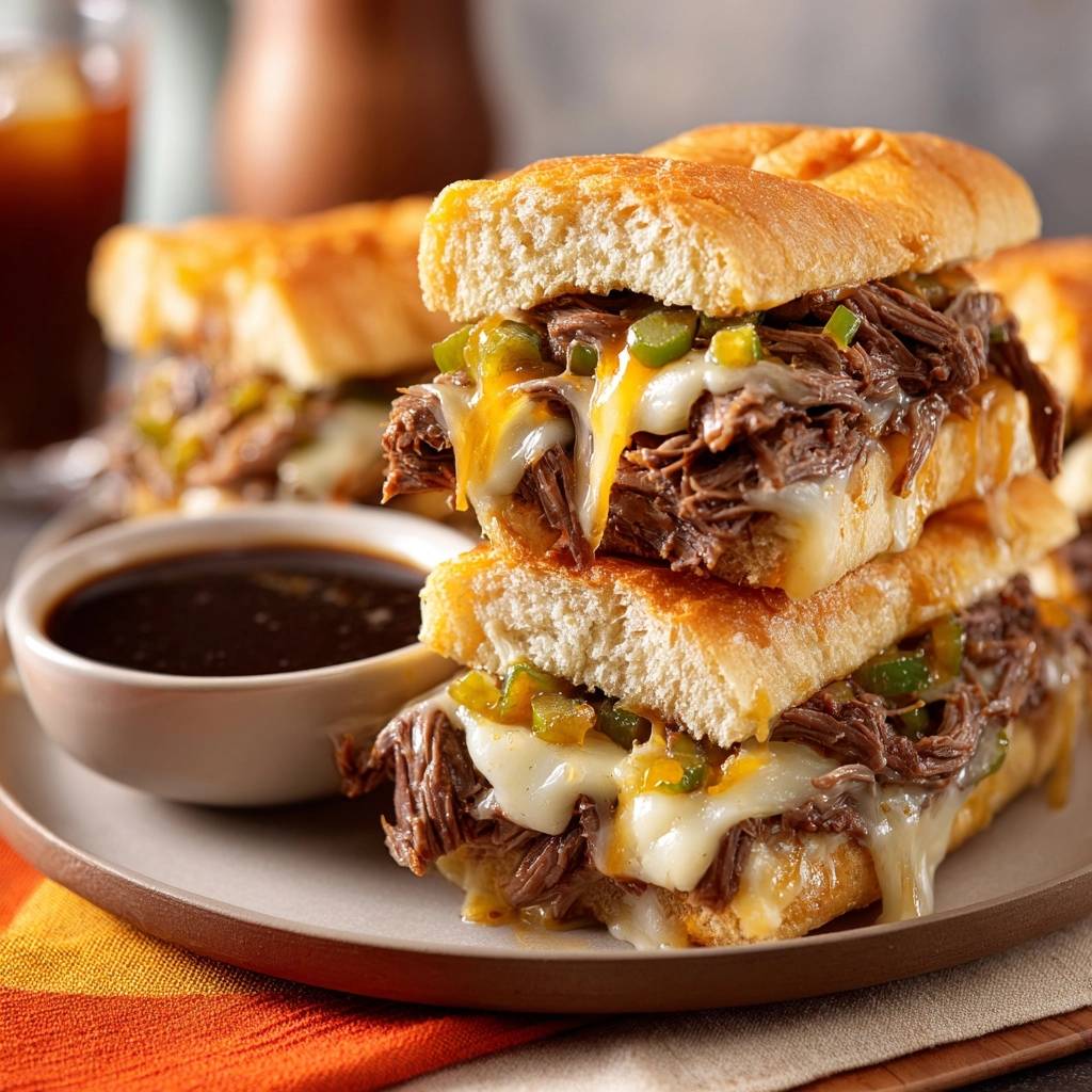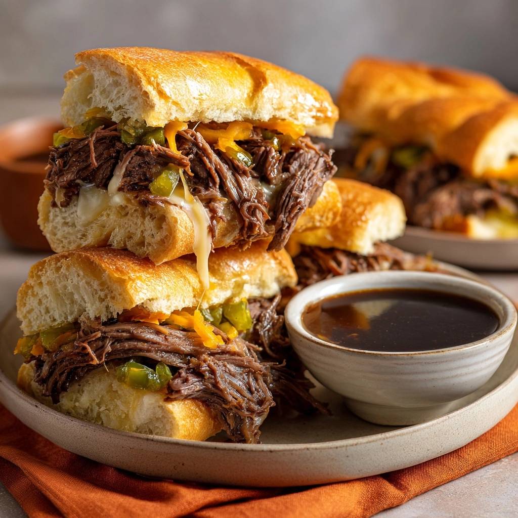 Stell dir vor, du beißt herzhaft in ein knuspriges Baguette, das mit zartem Pulled Beef überladen ist. Der Käse schmilzt blubbrig heraus, Paprika knirscht knackig mit, und dann tunkst du es in die reichhaltige Dip-Sauce. Saftig, aromatisch, unwiderstehlich – genau so hab ich es das erste Mal in Chicago erlebt, wo das French Dip Sandwich mich umgehauen hat.