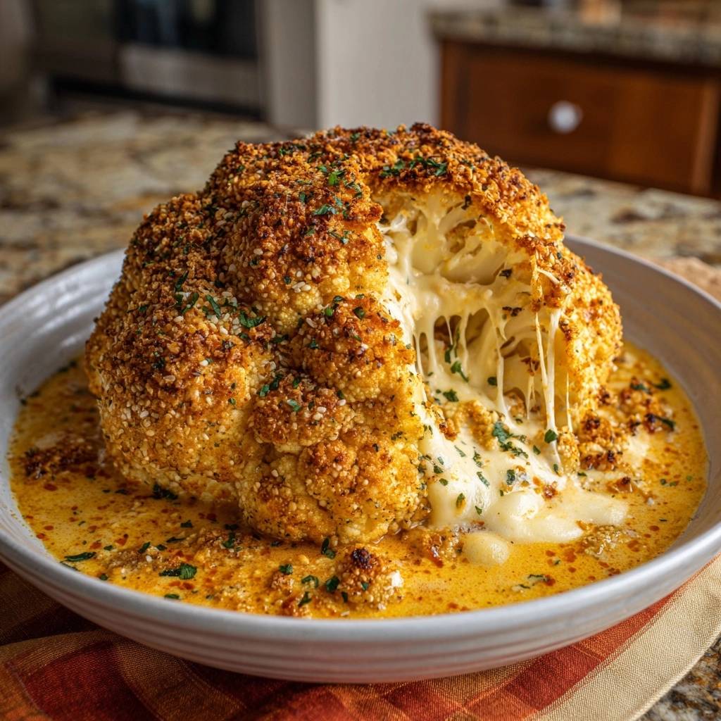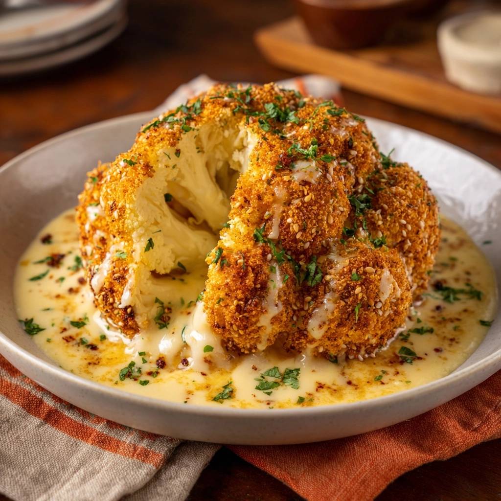 Dieses Gericht ist ein echtes Spektakel auf dem Teller. Die Kombination aus der salzigen Parmesan-Panko-Hülle und der cremigen Sauce im Boden der Form macht den Blumenkohl zum absoluten Star des Abends.