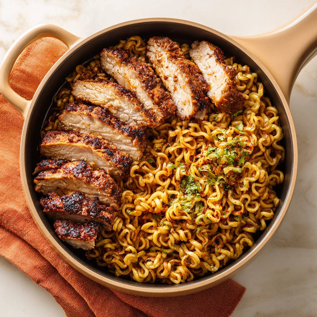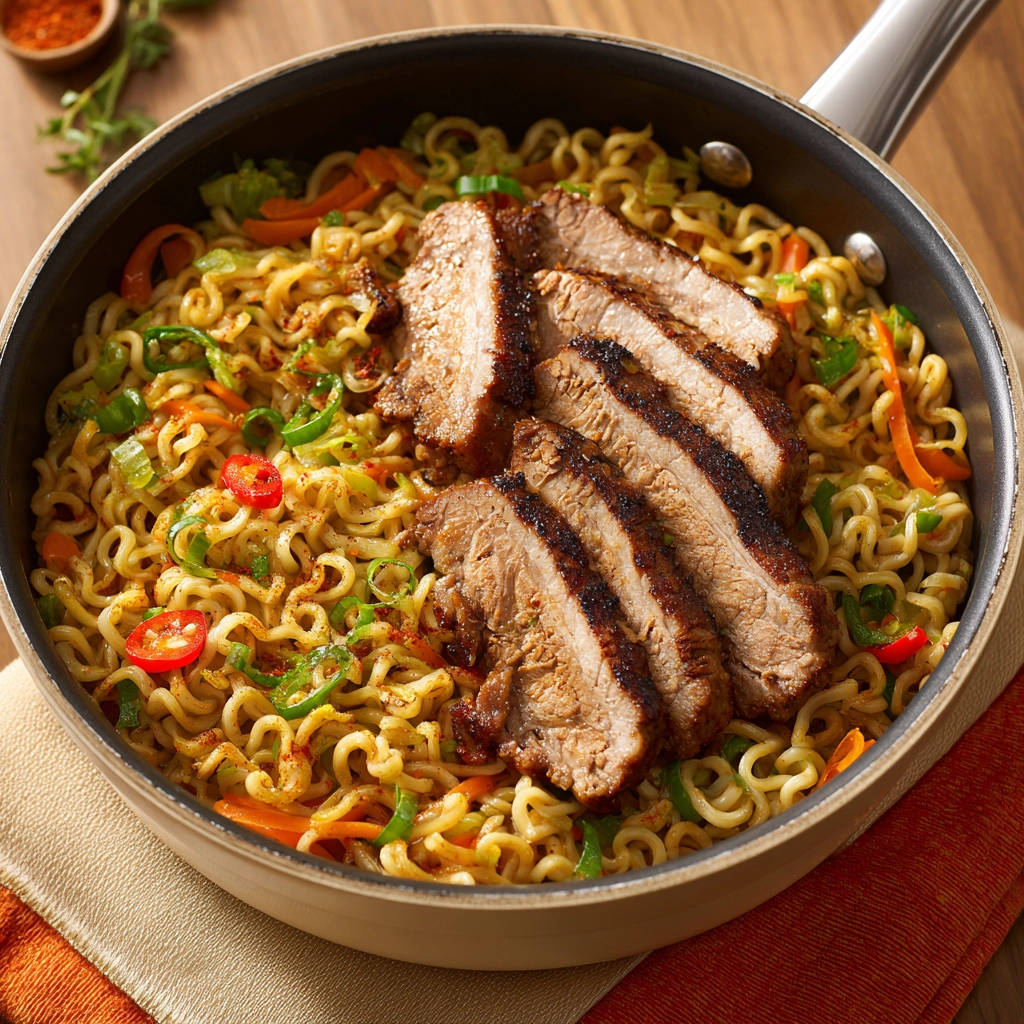 - – Während das Fleisch ruht, die Instant-Nudeln nach Packungsanweisung in Salzwasser garen (meist nur 2-3 Minuten), abgießen und kurz mit kaltem Wasser abschrecken, damit sie nicht zusammenkleben.