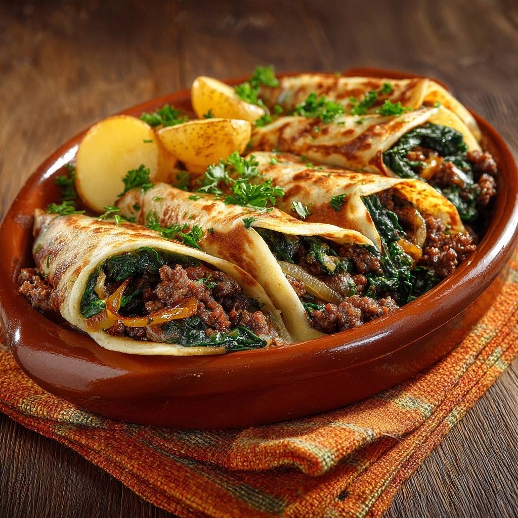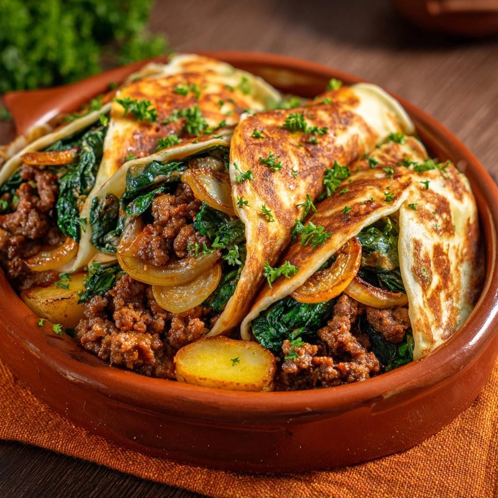 Der erste Biss knirscht so herrlich. Saftiges Hackfleisch mischt sich mit knackigem Spinat in einem goldbraunen Pfannkuchen, der außen knusprig ist. Du spürst die Wärme, riechst den frischen Knoblauch und die würzigen Gewürze. Das ist pure Küche für den Alltag.