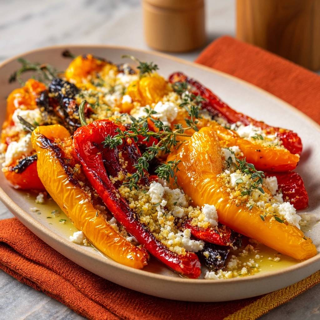 Es saugt Thymian-Öle auf, wird goldknusprig statt trocken. Kontrast zum saftigen Paprika und cremigen Feta. Röstzeit kurz halten, sonst bitter. Frisches Paniermehl schmeckt am besten.