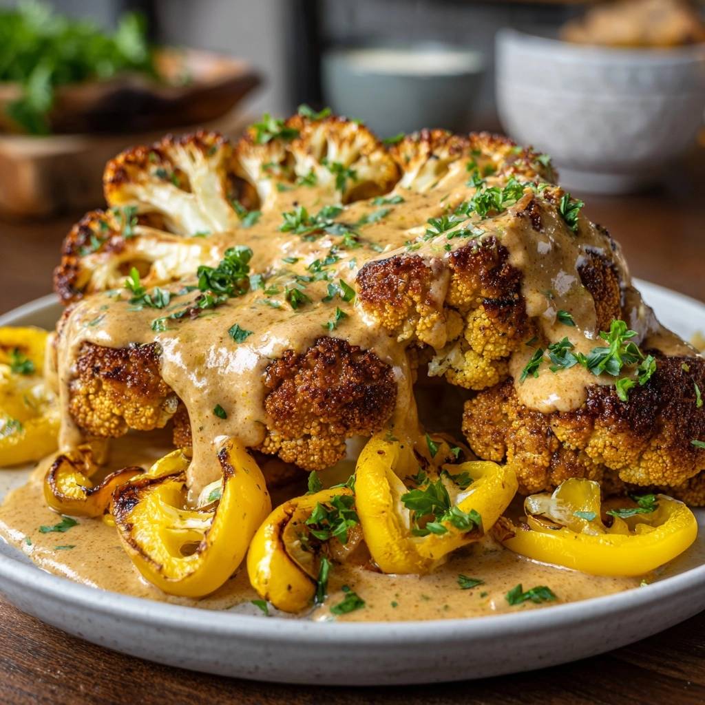 Stell dir vor, du beißt in eine goldbraune, fast schon fleischige Scheibe Blumenkohl, die außen herrlich knusprig und innen butterweich ist. Das nussige Aroma des Röstgemüses verbindet sich mit einer samtigen Sauce, die deine Zunge umschmeichelt.