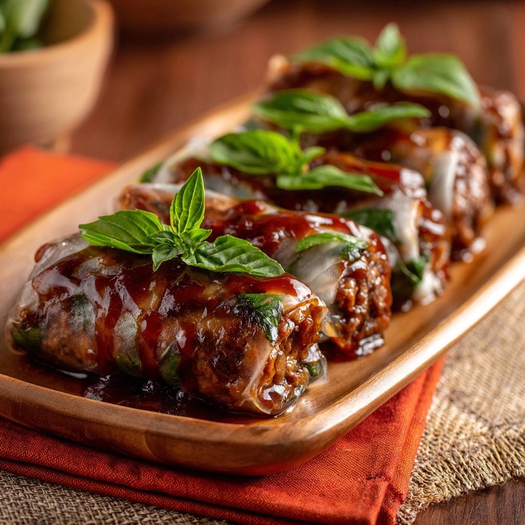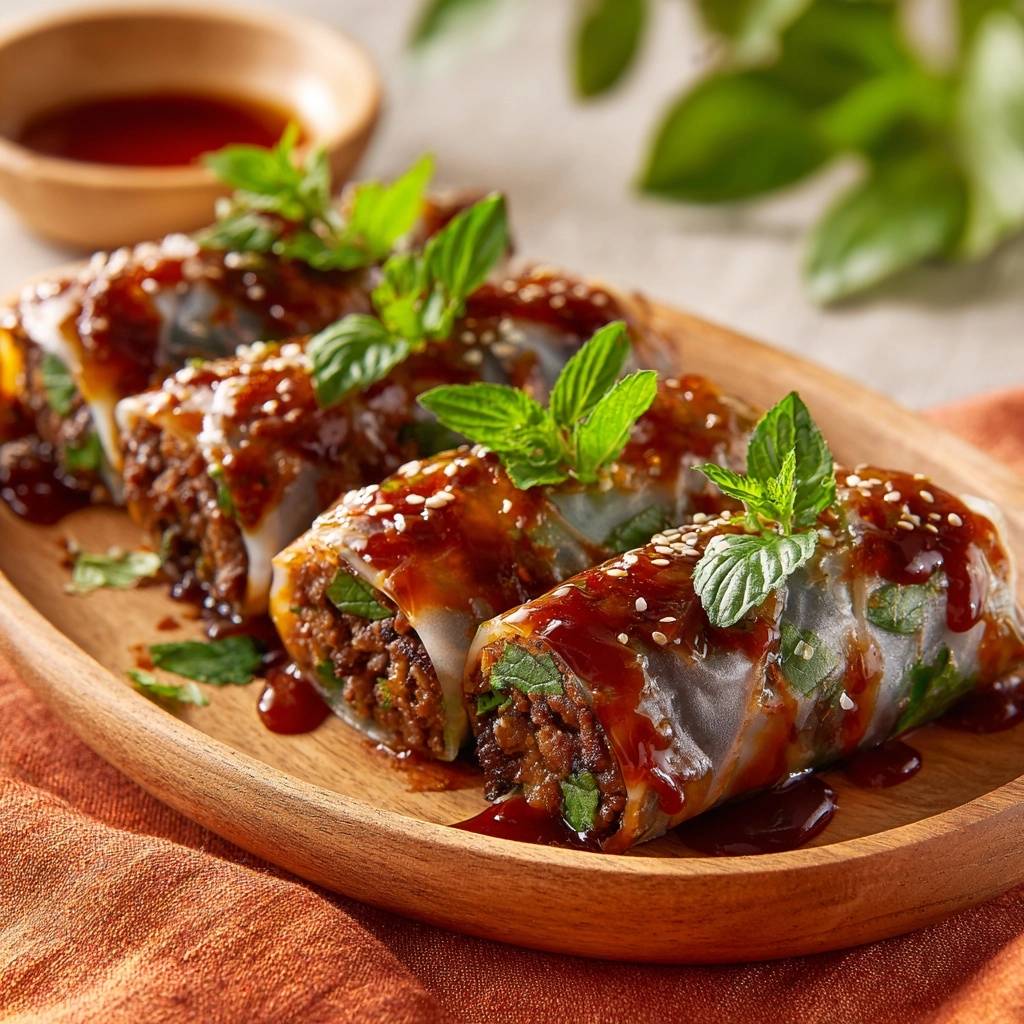 Stell dir vor, du beißt in eine Frühlingsrolle, und statt matschigem Chaos explodiert saftiges, glasiertes Rinderhack mit frischer Minze und Basilikum im Mund. Der Duft von Honig und Soja hängt in der Luft, Sesamsamen knacken leicht.