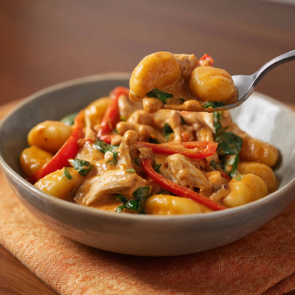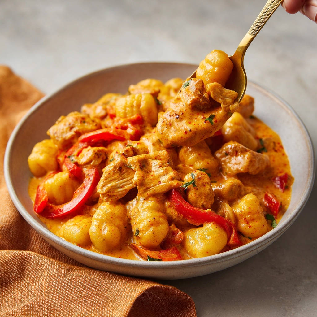 Voilà! Deine perfekt cremige Gnocchi mit Hähnchen und Paprika in Rahmsauce ist bereit zum Genießen!