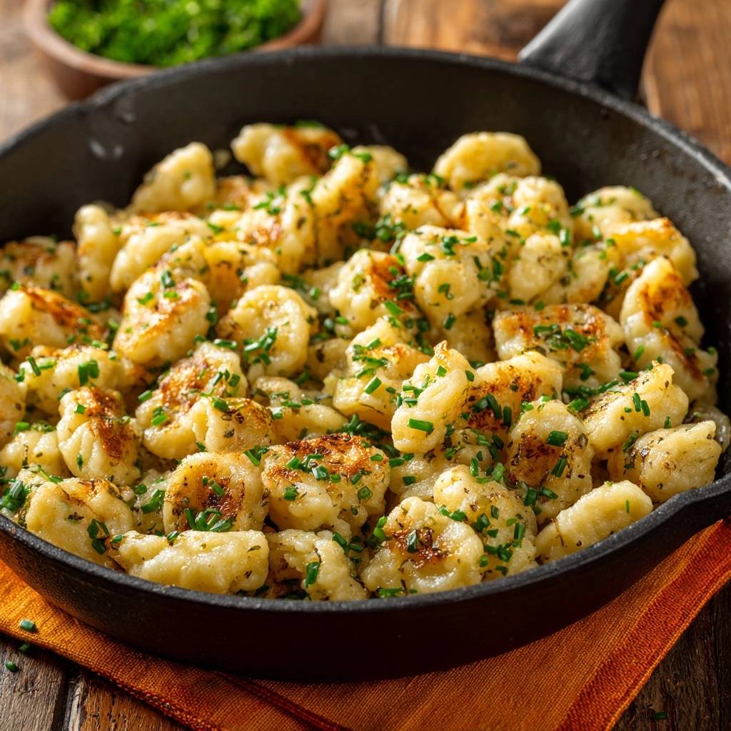 - Servieren: Schneiden Sie den Schnittlauch in feine Röllchen. Bestreuen Sie die heißen Gnocchi direkt in der gusseisernen Pfanne großzügig mit dem Grün. Die Resthitze der Pfanne reicht aus, um das Aroma des Schnittlauchs freizusetzen, ohne ihn zu verbrennen. Sofort in der Pfanne servieren.