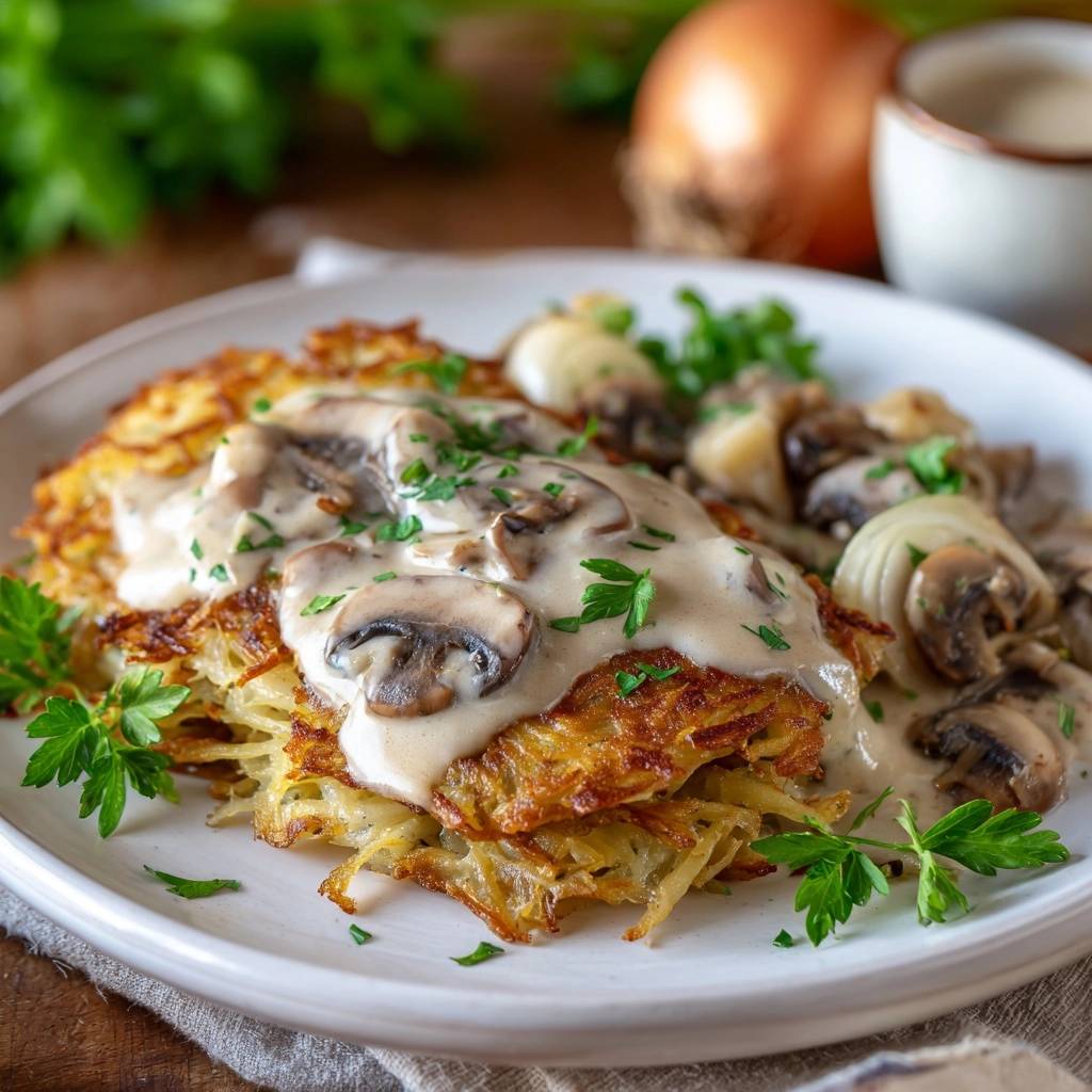 Goldbraune Kartoffel-Rösti mit cremiger Pilzsauce