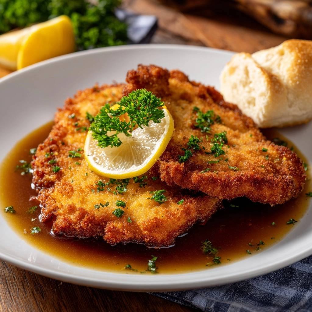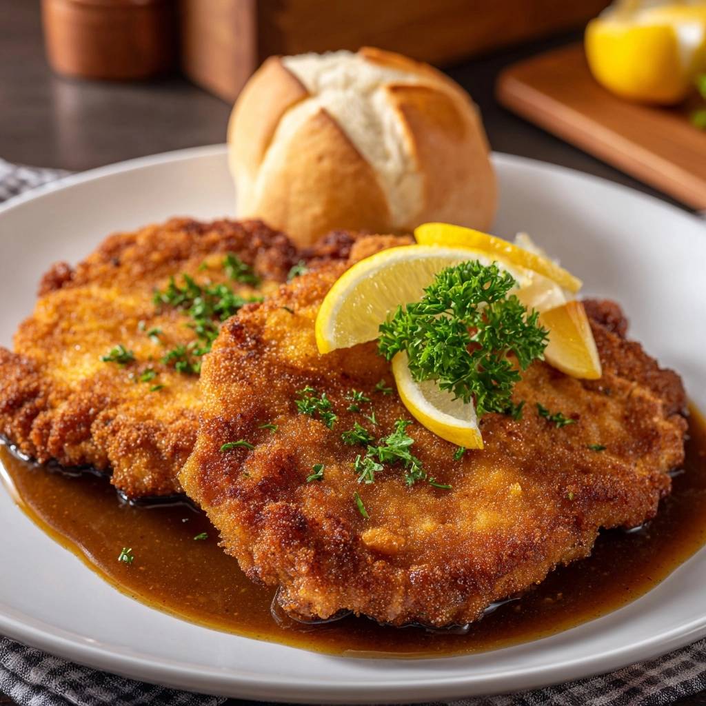- Servieren: Gießen Sie zuerst einen Spiegel der dunklen Sauce auf den Teller. Betten Sie das Schnitzel vorsichtig darauf (oder daneben), um die Unterseite nicht sofort durchzuweichen. Garnieren Sie mit Zitronenscheiben und reichlich krauser Petersilie. Servieren Sie dazu die frische Semmel, um die Sauce aufzunehmen.