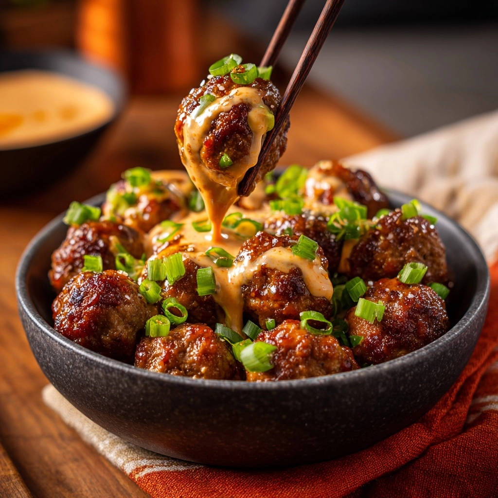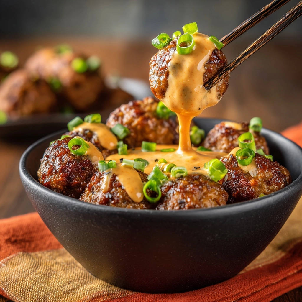 - – Die cremige Sriracha-Sauce über die Hackbällchen träufeln oder separat dazu servieren.