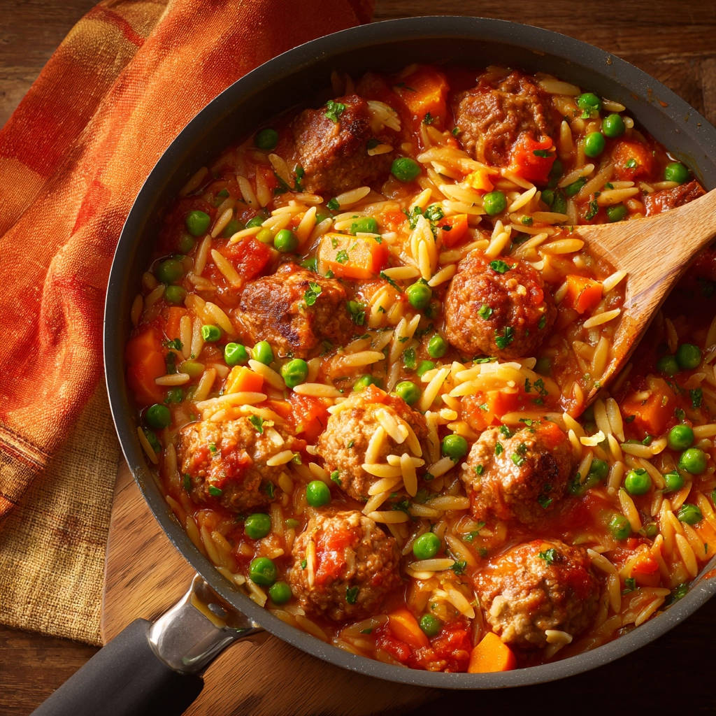 Genießt eure hausgemachte Hackbällchen in Tomaten-Orzo-Pfanne!
