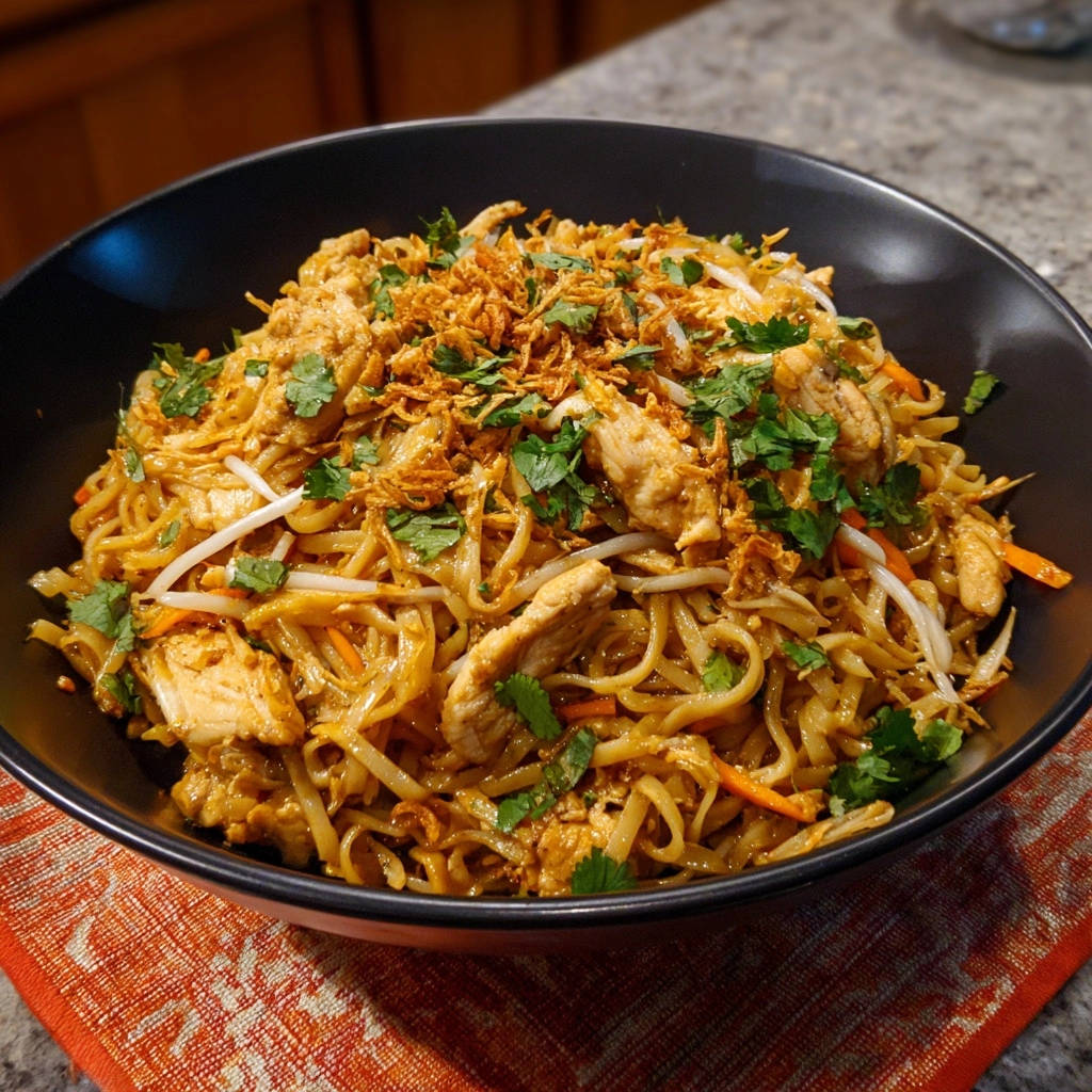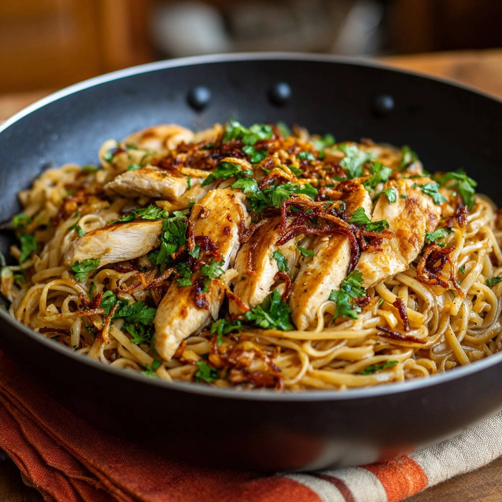 - Servieren: Die Hähnchen-Nudel-Pfanne sofort auf Tellern anrichten. Großzügig mit frischem Koriander und knusprigen Röstzwiebeln bestreuen. Sofort genießen!