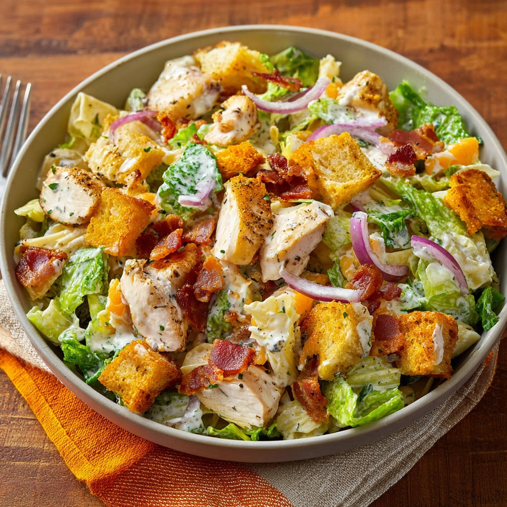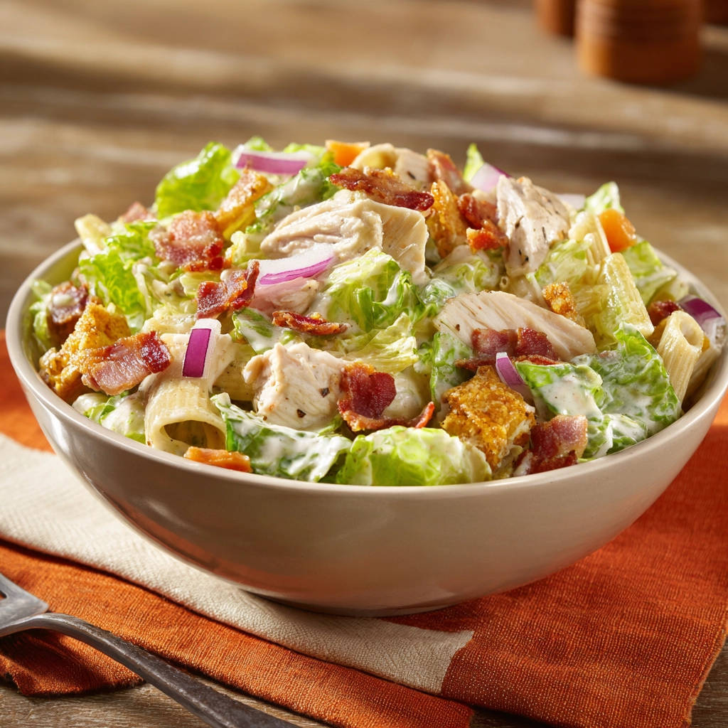 - Salat-Pasta-Mischung mit ausreichend Caesar Dressing vermengen. Hähnchenstücke, knusprigen Speck und Croutons darüber verteilen.