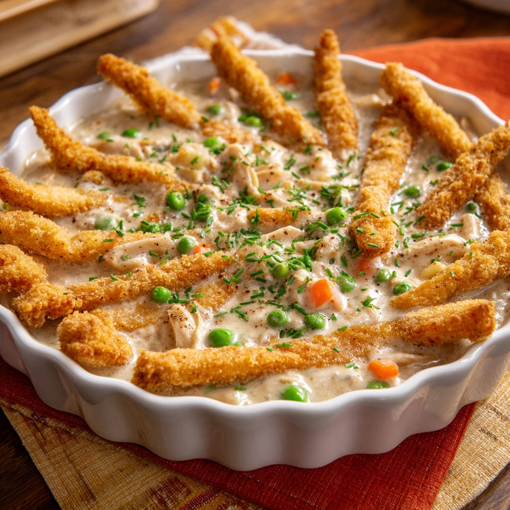- Vorbereitung am Vortag: Sie können die cremige Hähnchen-Gemüse-Mischung vorbereiten und in die Auflaufform füllen. Lassen Sie sie vollständig abkühlen, decken Sie sie ab und stellen Sie sie in den Kühlschrank. Am nächsten Tag erwärmen Sie die Basis im Ofen und bereiten die Sticks frisch zu, bevor Sie alles wie beschrieben anrichten.