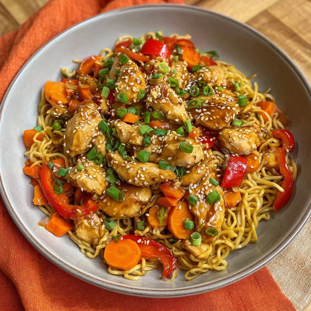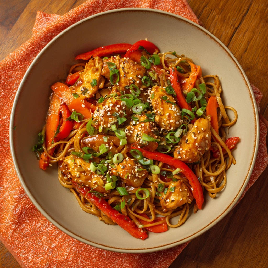 - Servieren: Verteilt die Hähnchen-Nudelpfanne auf Tellern. Bestreut sie großzügig mit Sesam und garniert sie mit den gehackten Frühlingszwiebeln. Sofort servieren und genießen!