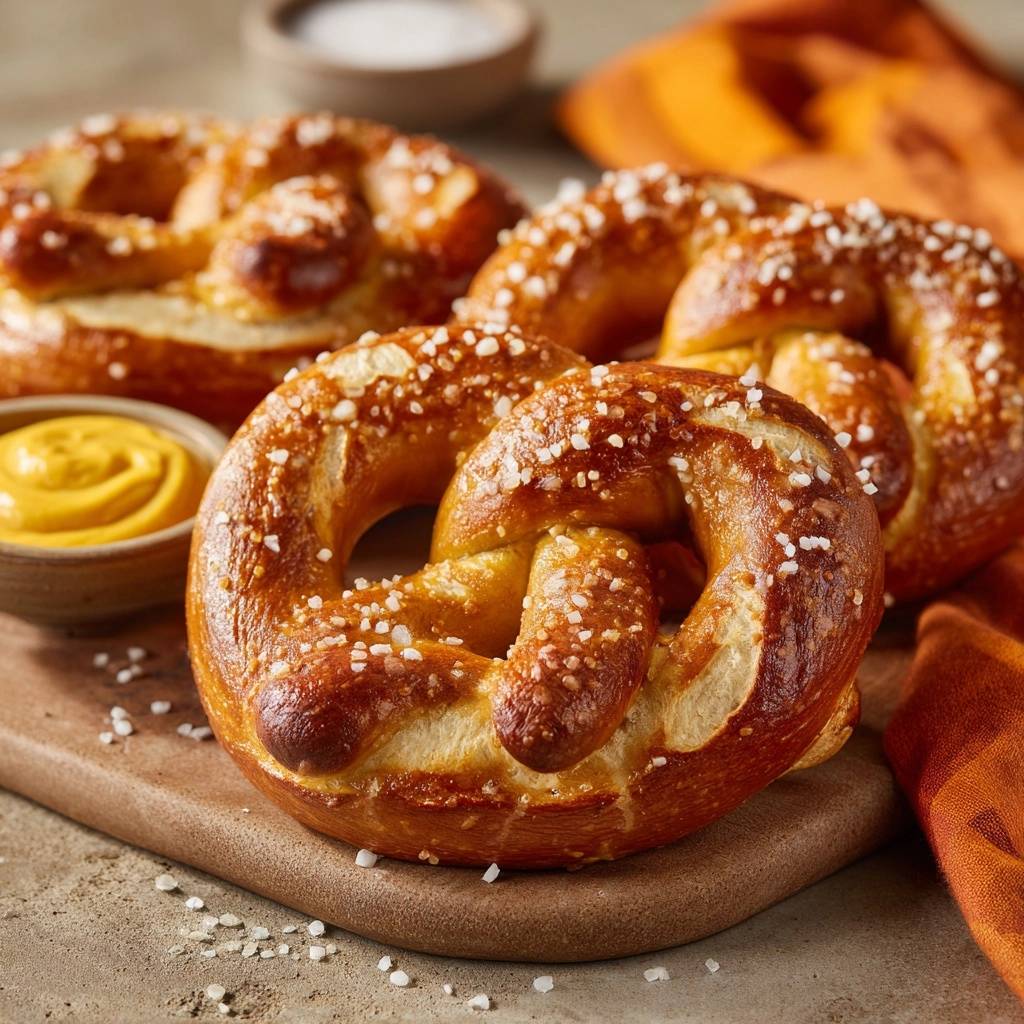 - Servieren: Die Brezeln kurz auf einem Gitter abkühlen lassen. Am besten noch warm mit einer Portion mittelscharfem Senf servieren, wie auf dem Bild gezeigt.