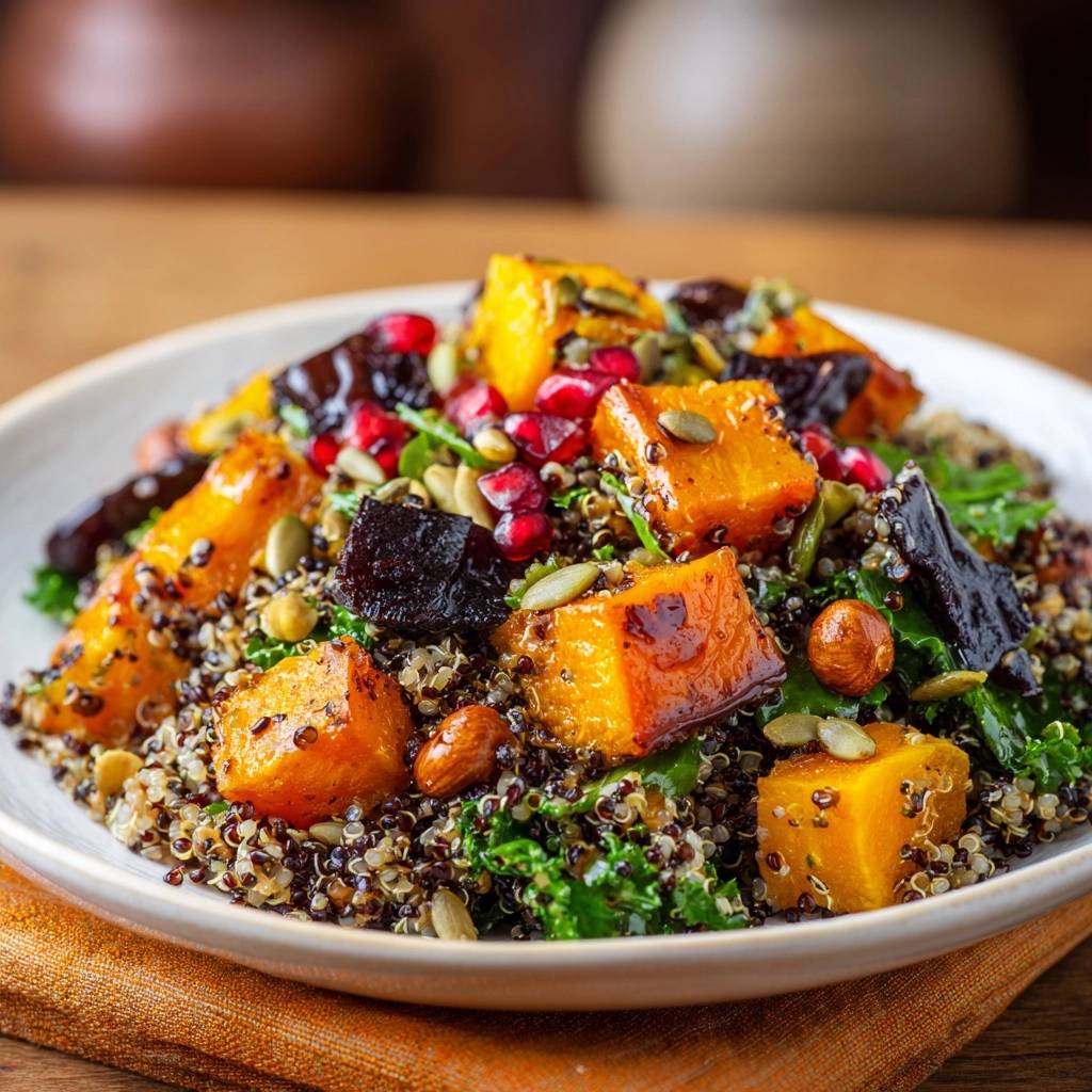 Stell dir vor, du beißt in goldbraunen Kürbiswürfel, die knackig knacken und süß karamellisieren. Dazu cremige Aubergine, fluffige Quinoa und der saftige Knall von Granatapfelkernen. Der Duft aus dem Ofen zieht durch die Küche, herbstlich und einladend.