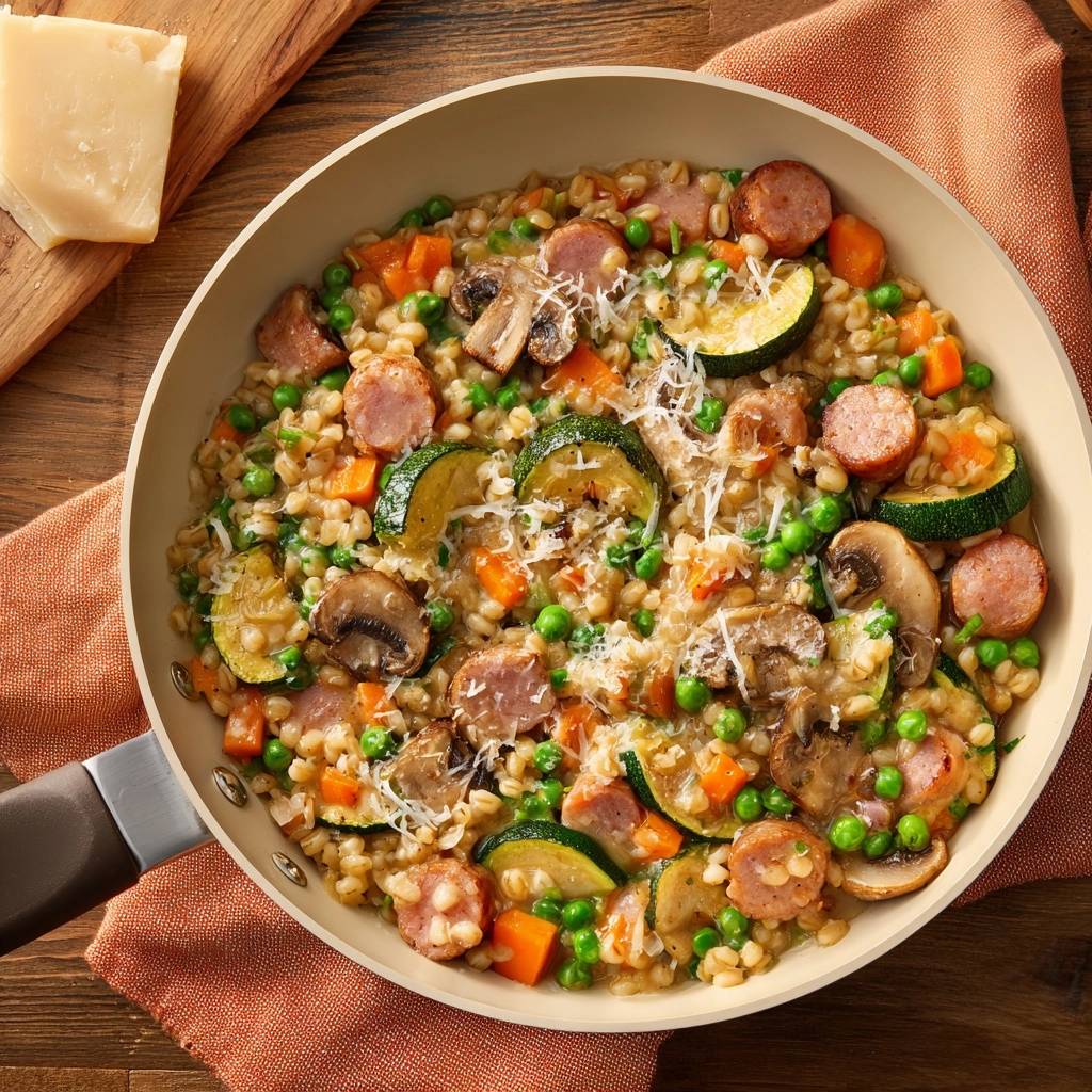 Herzhafte Graupenpfanne mit Wurst und Gemüse