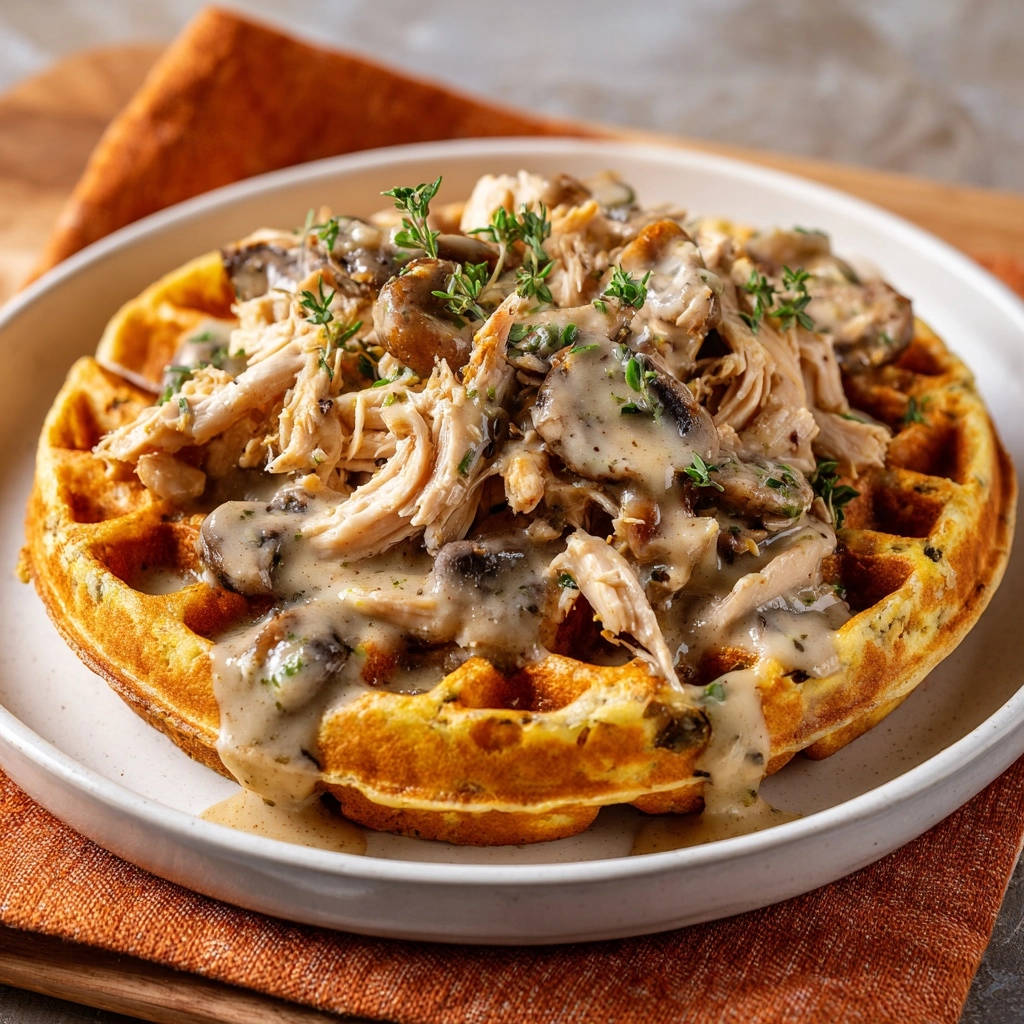 Stellen Sie sich eine knusprige, leicht salzige Waffel vor, die den vollen Geschmack einer cremigen Hähnchen-Pilz-Soße perfekt aufnimmt.