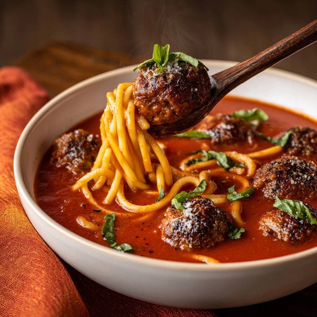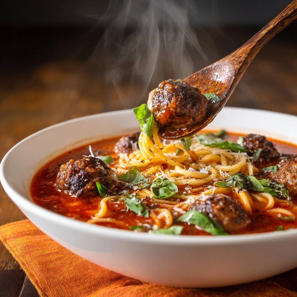 Diese herzhafte Spaghetti-Fleischbällchen-Suppe ist für mich das ultimative Wohlfühlessen. Sie vereint die besten Eigenschaften eines klassischen Pasta-Gerichts mit der wohligen Wärme eines Eintopfs. Du wirst nie wieder harte Fleischklößchen akzeptieren.