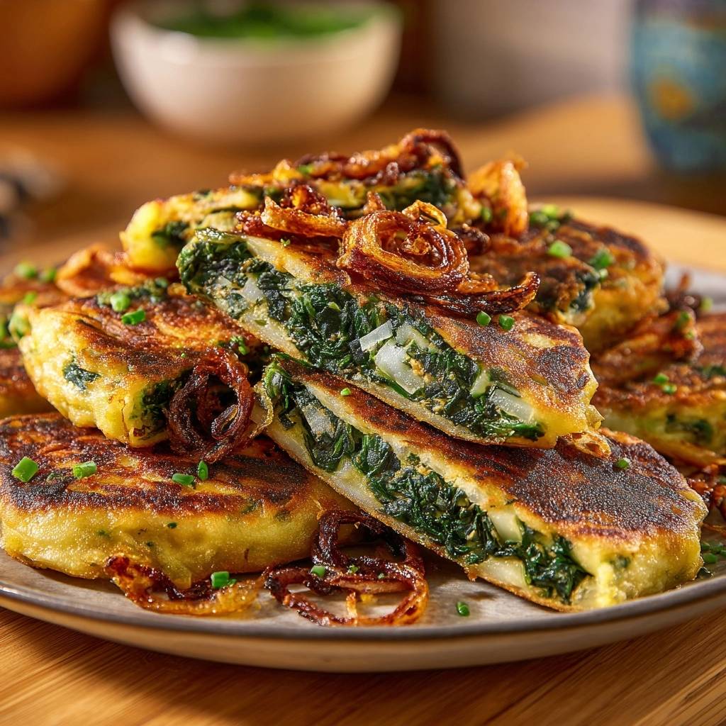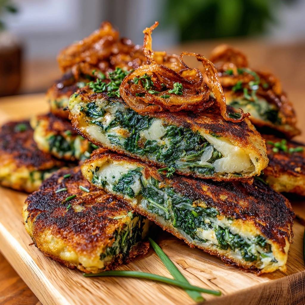Das Mehl entzieht der Zwiebel die Feuchtigkeit und lässt sie extrem knusprig werden. Diese kleinen „Crunch-Bomben“ sind der ideale Kontrast zum weichen Kern der Spinat-Kartoffel-Puffer.