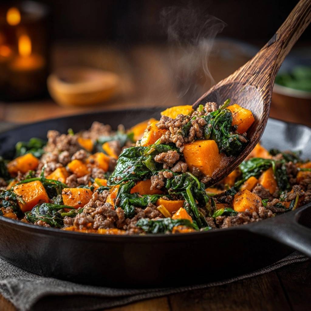 - Hebe nun die vorgerösteten Süßkartoffelwürfel vorsichtig unter die Fleisch-Spinat-Mischung. Erwärme alles zusammen für nur 2 Minuten. Durch das späte Hinzufügen und die vorherige Versiegelung der Oberfläche bleiben die Süßkartoffeln perfekt in Form und behalten ihren Biss.