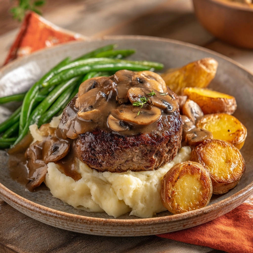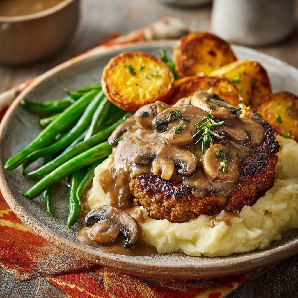 - Anrichten: Das cremige Kartoffelpüree mittig auf Tellern verteilen. Den saftigen Hackbraten daraufsetzen und großzügig mit der Pilzrahmsoße übergießen. Die grünen Bohnen und die knusprigen Bratkartoffeln daneben anrichten. Mit frischen Kräutern garnieren und sofort servieren. Genießen Sie jeden saftigen Bissen!