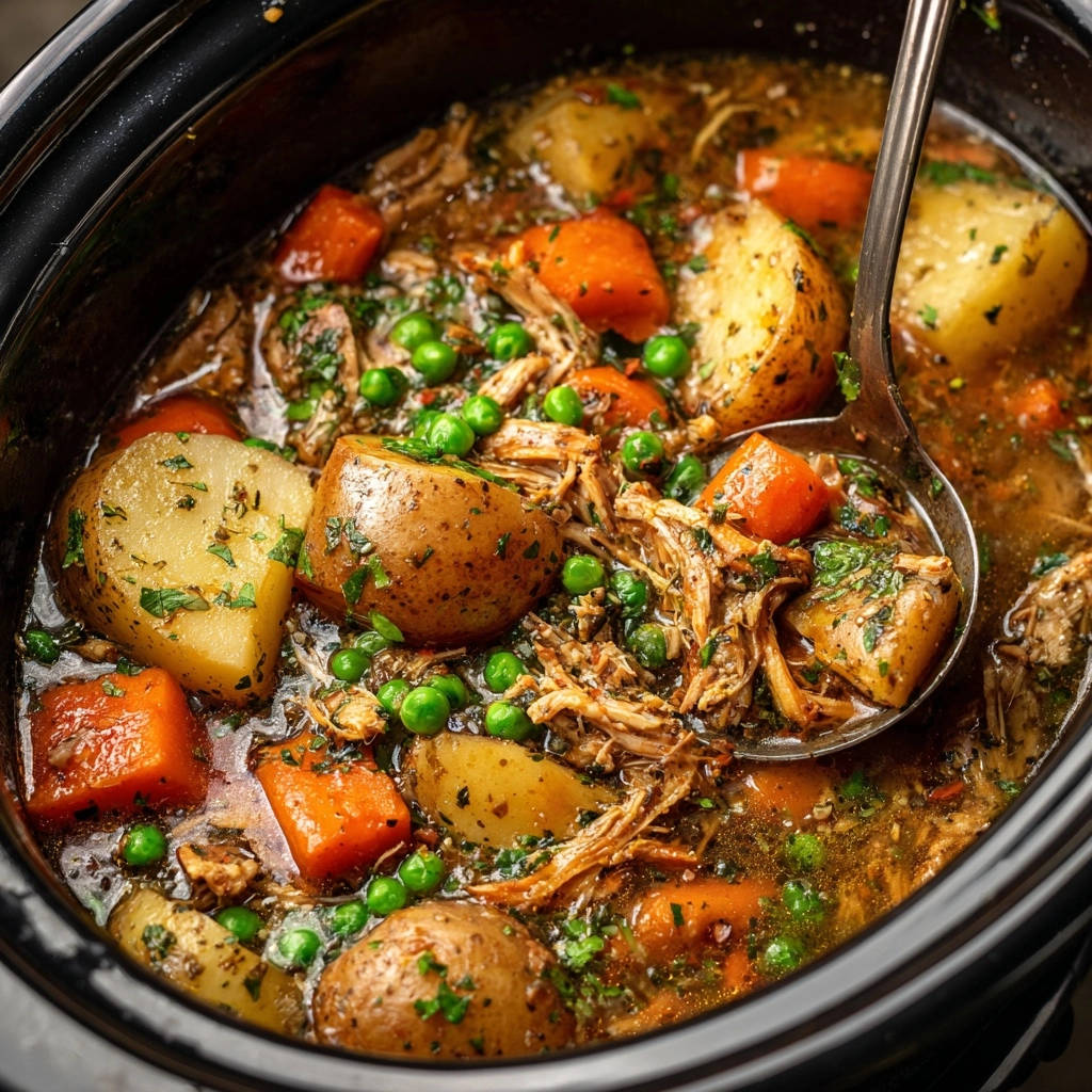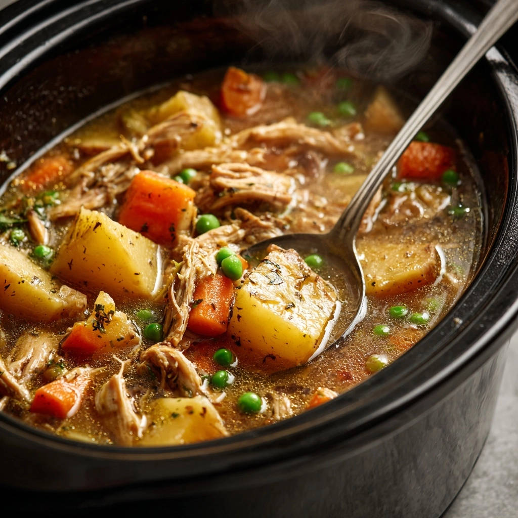 - Fertigstellung: Nimm das Hähnchen aus dem Slow Cooker und zerzupfe es mit zwei Gabeln direkt im Topf oder auf einem Schneidebrett und gib es dann zurück in den Eintopf. Rühre die TK-Erbsen unter und lasse sie noch 5-10 Minuten mitgaren, bis sie durchgewärmt sind und ihre leuchtende Farbe behalten. Schmecke den Eintopf final mit Salz und Pfeffer ab.