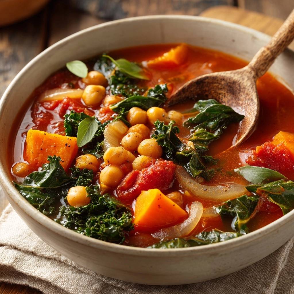 Stell dir vor, du löffelst eine Brühe, die so tiefrot und würzig ist, dass sie dich sofort von innen wärmt. Die Süßkartoffeln sind butterweich, haben aber noch ihre Form, während der Grünkohl mit einem leichten Biss und leuchtendem Grün überzeugt.