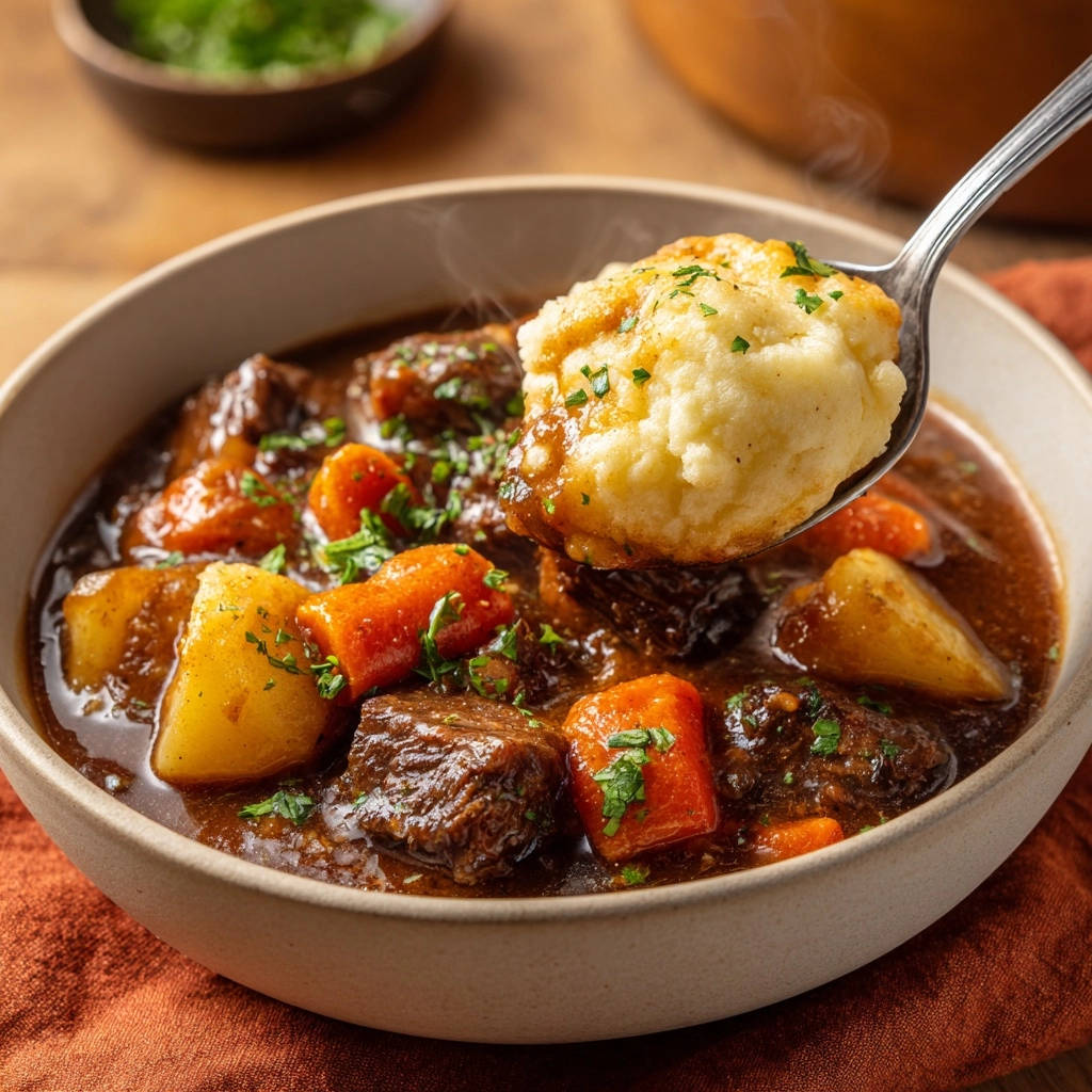 Dieser herzhafte Rindereintopf mit Kartoffelklößen schmeckt oft am nächsten Tag noch besser, da die Aromen Zeit hatten, sich voll zu entfalten.