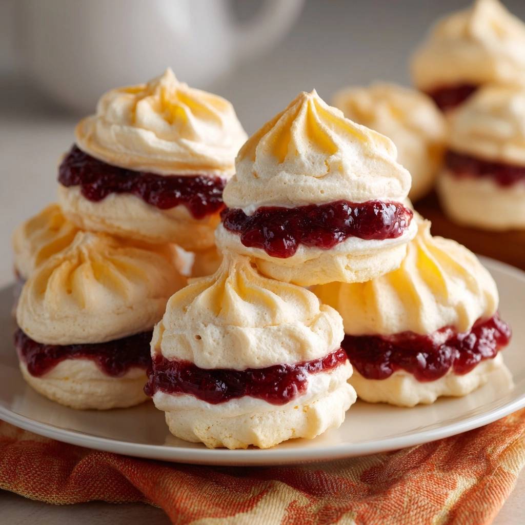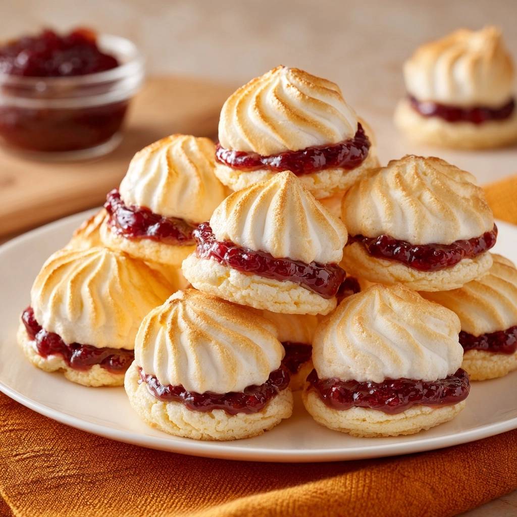 Böden dünn mit Marmelade bestreichen. Hauben spiralförmig mit Spritzbeutel drauf. Spirale sorgt für Höhe und Stabilität.