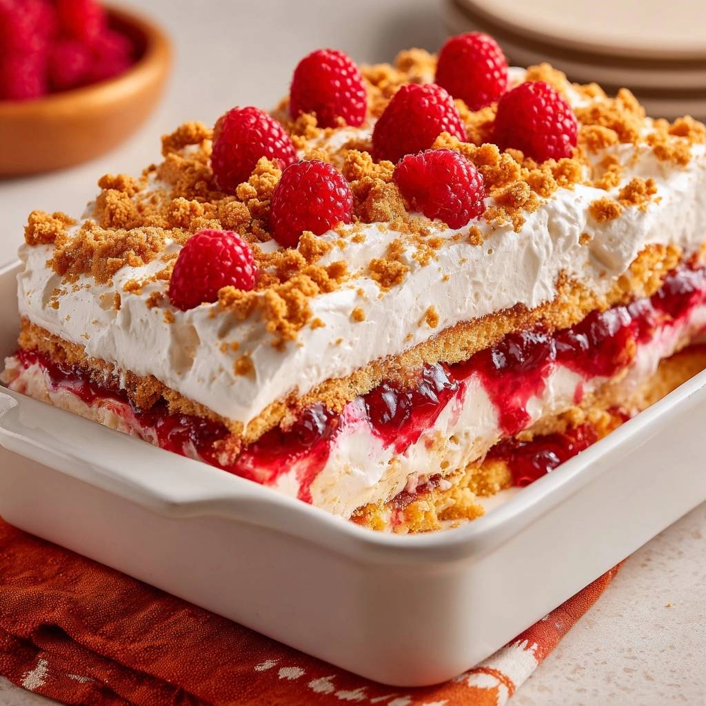 Nimm kalte Sahne für besseren Schlagschaum. Frische Himbeeren sind saftiger als TK. Butterkekse ohne Füllung rösten am besten. Alles in 20×30 cm Form passt genau.