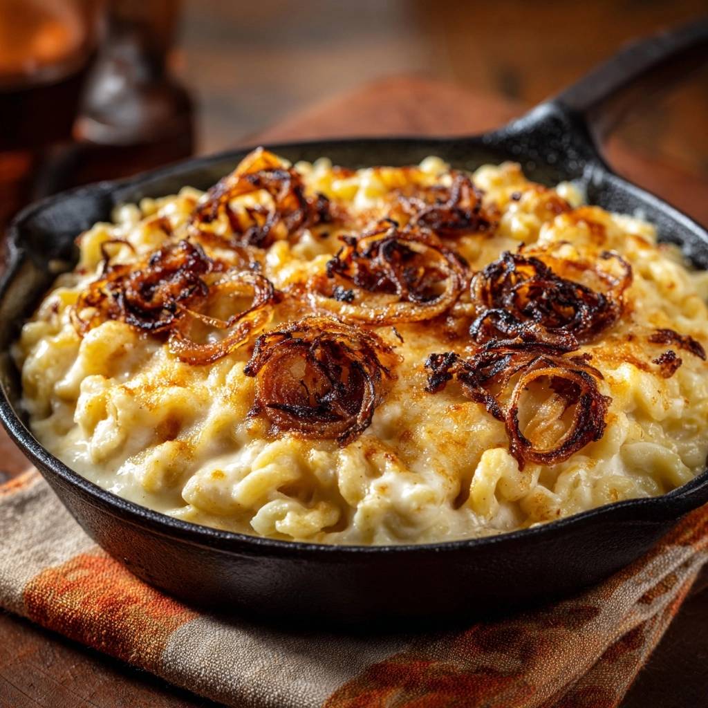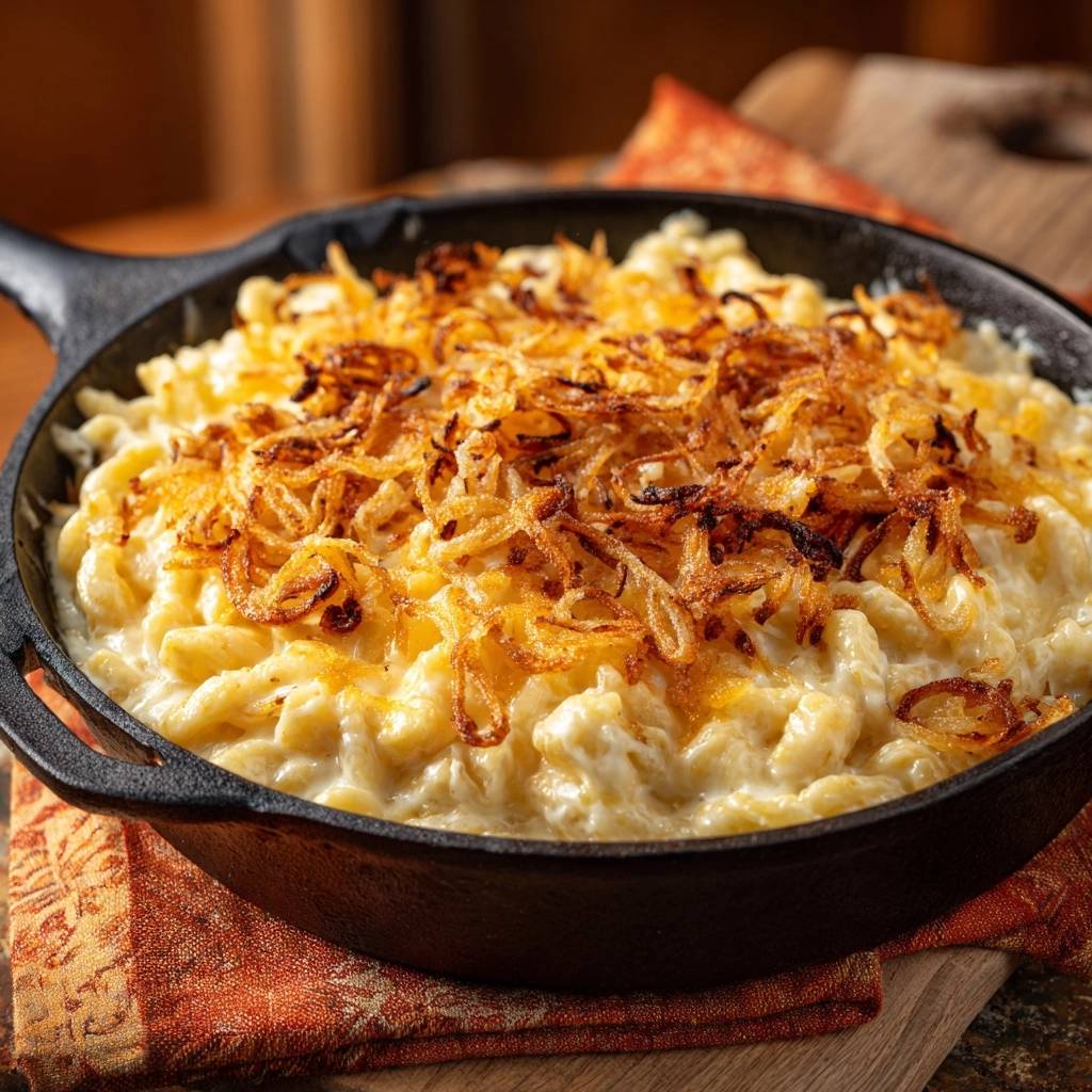 Leicht: Vegane Spätzle (Mehl, Wasser, Kurkuma), pflanzlichen Käse (Cashew, Hefe, Agar), Öl statt Butter. Zwiebeltrick gleich. Schmeckt fast identisch, cremig durch Nussbasis. Pro-Tipp: Rauchgewürz für Käse-Aroma.