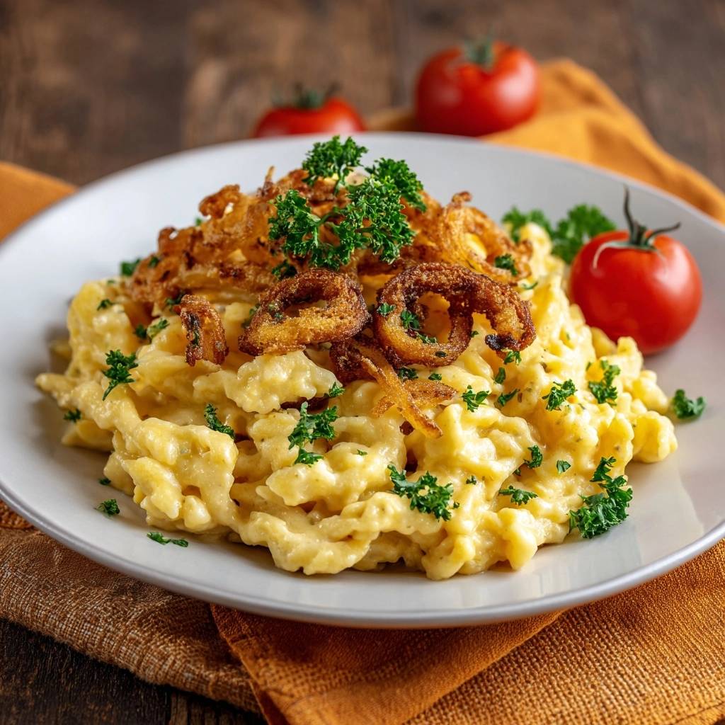 Stell dir vor, du beißt in die ersten Käsespätzle mit knusprigen Zwiebelringen. Der Käse zieht sich sämig, die Spätzle sind goldbraun gebräunt, und oben drauf knacken diese Zwiebelringe so perfekt, dass du fast die Augen zumachst vor lauter Genuss.
