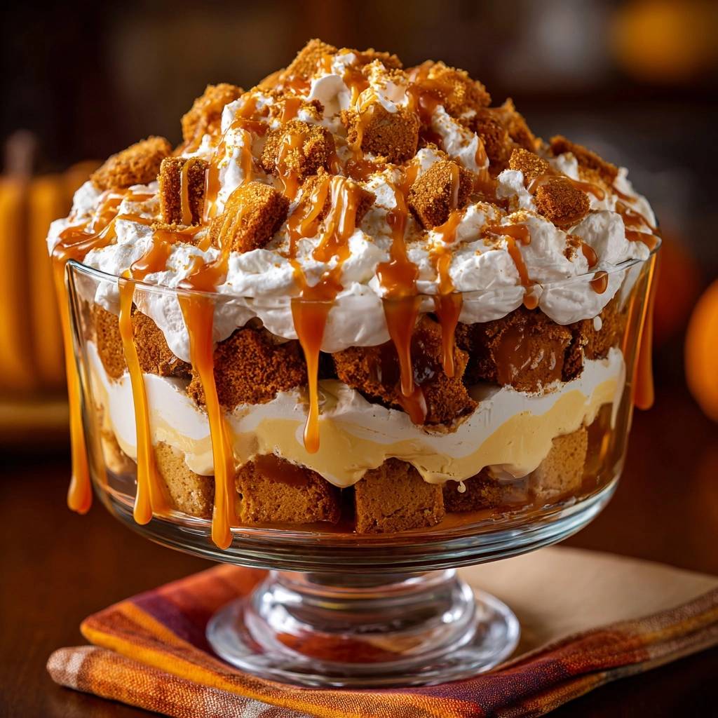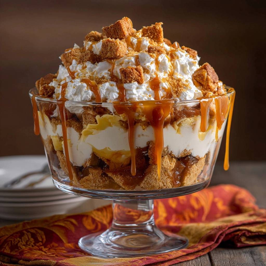 - In ein großes Trifle-Glas oder vier große Dessertgläser schichten: Beginne mit einer dünnen Schicht knuspriger Krümel als Basis. Darauf 2 EL Karamellsoße träufeln, dann 3 EL Vanillepudding verteilen und mit Schlagsahne bedecken. Wiederhole die Schichten (Krümel, Karamell, Pudding, Sahne), bis die Gläser gefüllt sind und mit einer dicken Schicht Schlagsahne abschließen.