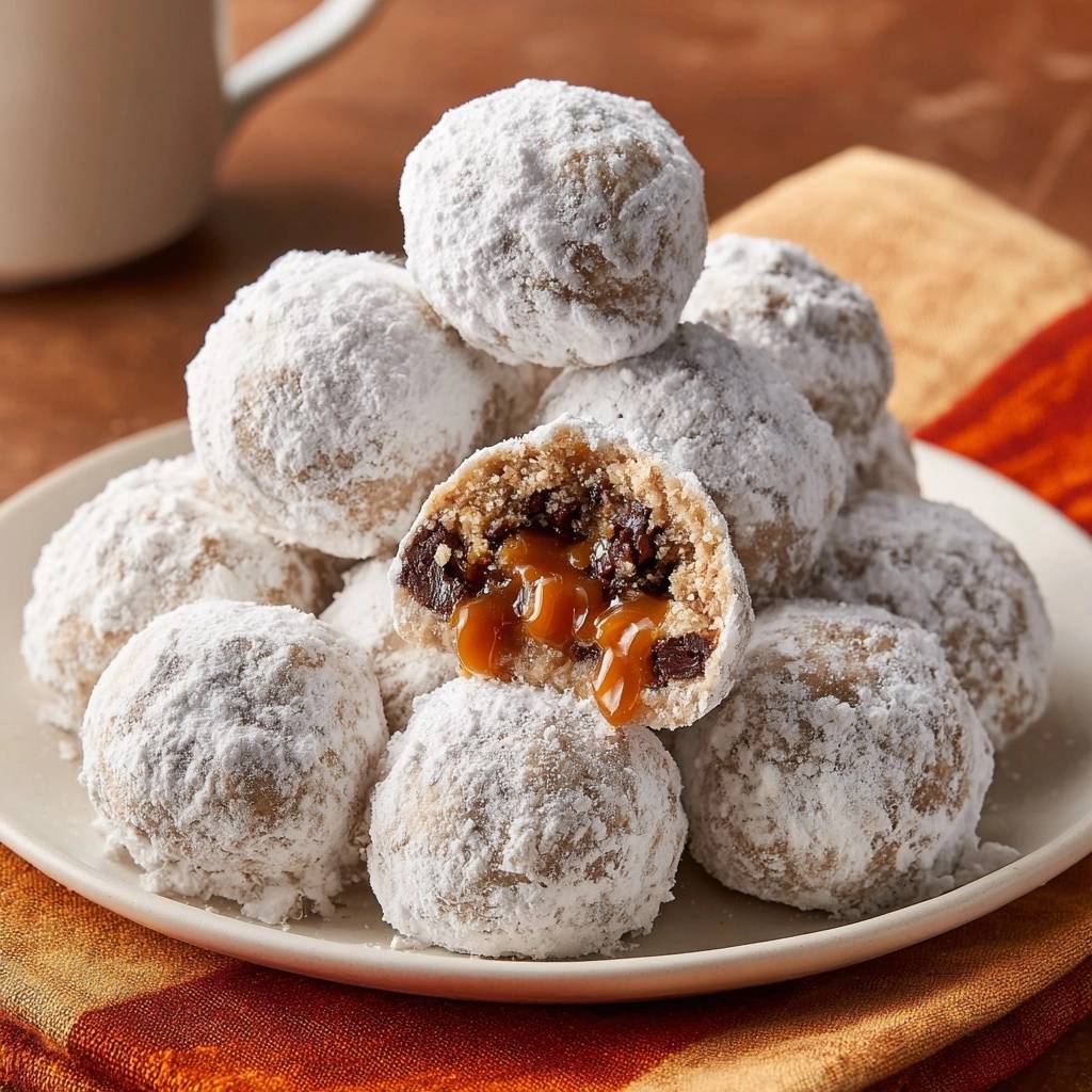 Stell dir vor, du beißt in eine pudrige Schneekugel, und innen explodiert cremiger Karamell mit saftigen Rosinen. Der Duft von Vanille und Butter hängt in der Luft, und nichts läuft aus. Diese Karamell-Rosinen-Schneekugeln sind so fluffig, dass sie auf der Zunge zergehen.
