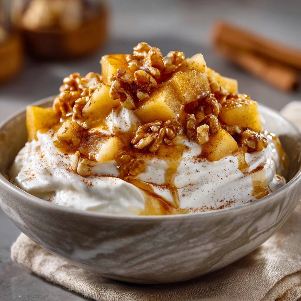 - Cremig-knusprig: Joghurt umhüllt die warmen Äpfel und Walnüsse für Textur-Kontrast.