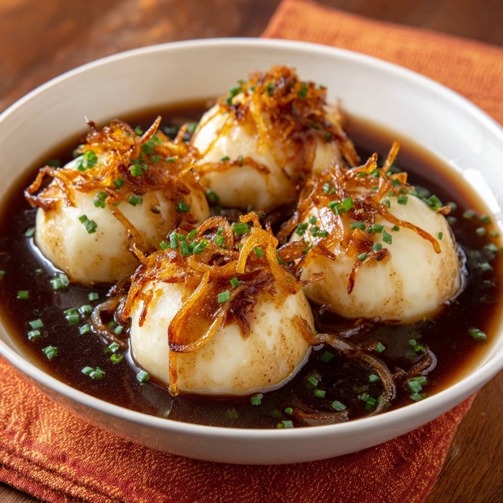 - Knödel in die Soße geben, kurz ziehen lassen. Mit frittierten Zwiebeln und gehacktem Schnittlauch servieren. Guten Appetit – fluffig, saftig, fehlerfrei!