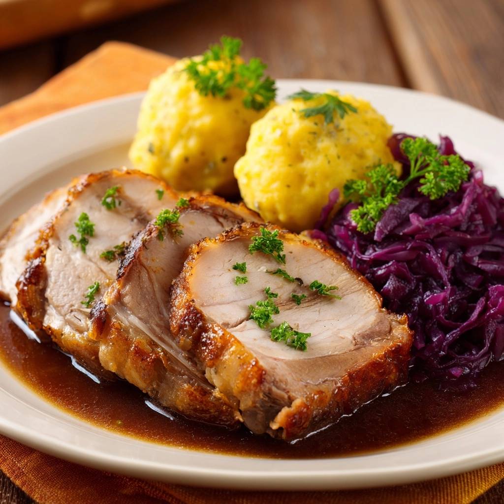 Klassischer Krustenbraten vom Schwein mit Rotkohl & Knödeln