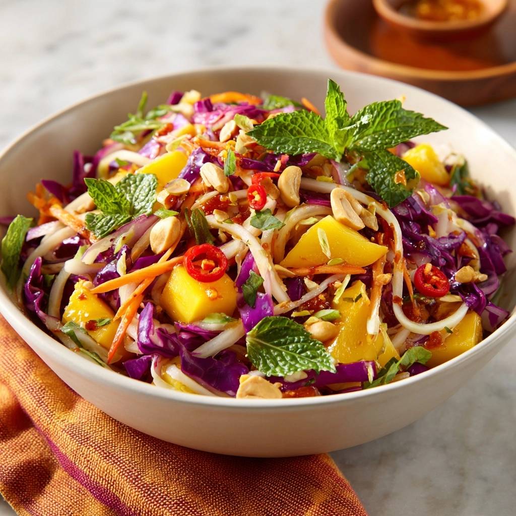 Er explodiert vor Frische. Das lila Kraut bleibt knackig, Mango bringt natürliche Süße, Glasnudeln sorgen für Biss. Alles vegan und ohne tierische Produkte.