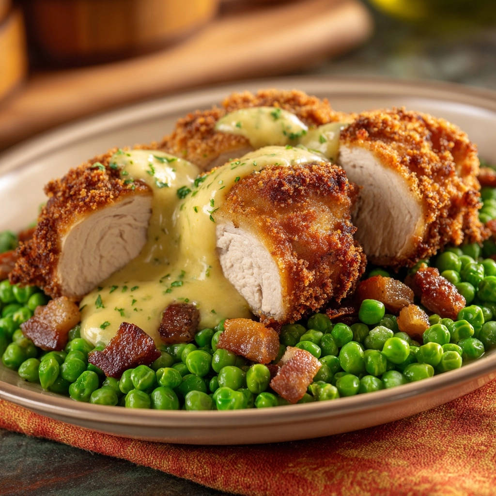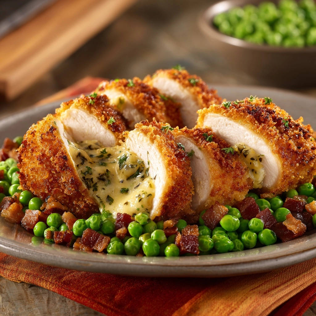 Richten Sie die aufgeschnittenen Hähnchenbrüste auf den Speck-Erbsen an und servieren Sie sie sofort, solange die Füllung noch wunderbar cremig ist. Guten Appetit!