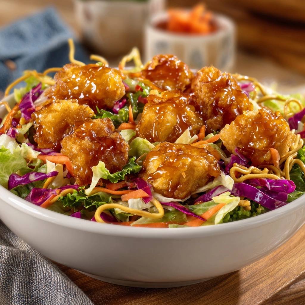 - Servieren: Platziere das glänzende Hähnchen sofort auf dem Salatbett. Garniere die Bowl großzügig mit den knusprigen Chow-Mein-Nudeln. Durch die doppelte Stärkeschicht und das zweifache Frittieren bleibt der „Crunch“ trotz der feuchten Sauce bis zum letzten Bissen erhalten.