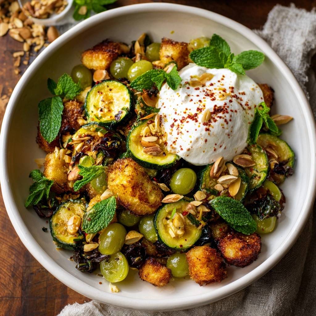 Würze jetzt großzügig mit Meersalz, den Chiliflocken und dem frischen Zitronenabrieb. Die Säure der Zitrone hebt den Geschmack der Trauben und der Zucchini sofort an.