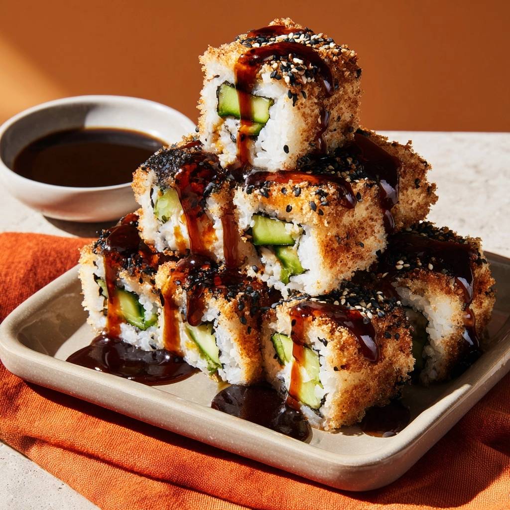 Stell dir vor, du beißt in eine dieser Rolls ab. Die goldbraune Panko-Kruste knackt laut, dann kommt die saftige Gurke mit dem klebrigen Sushi-Reis. Knusprig außen, frisch innen, und das alles ohne den üblichen Matsch-Effekt.