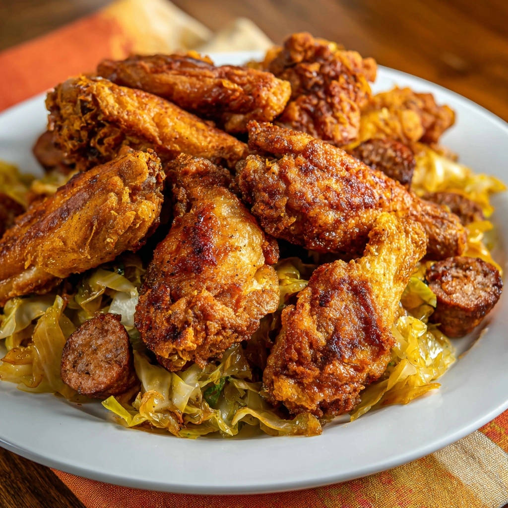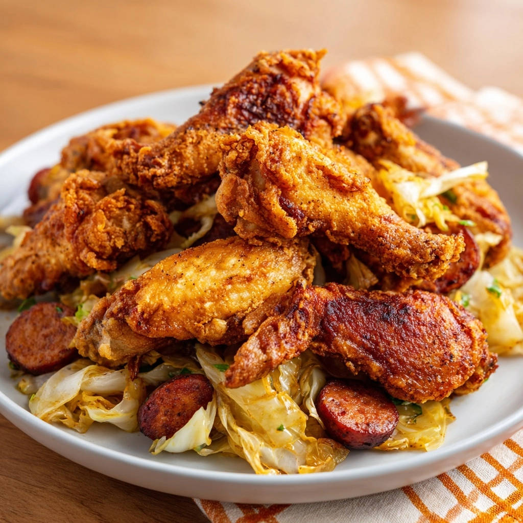 - Richten Sie das geschmorte Kraut und die Wurst auf Tellern an. Legen Sie die frisch frittierten, knusprigen Hähnchenflügel darauf.
