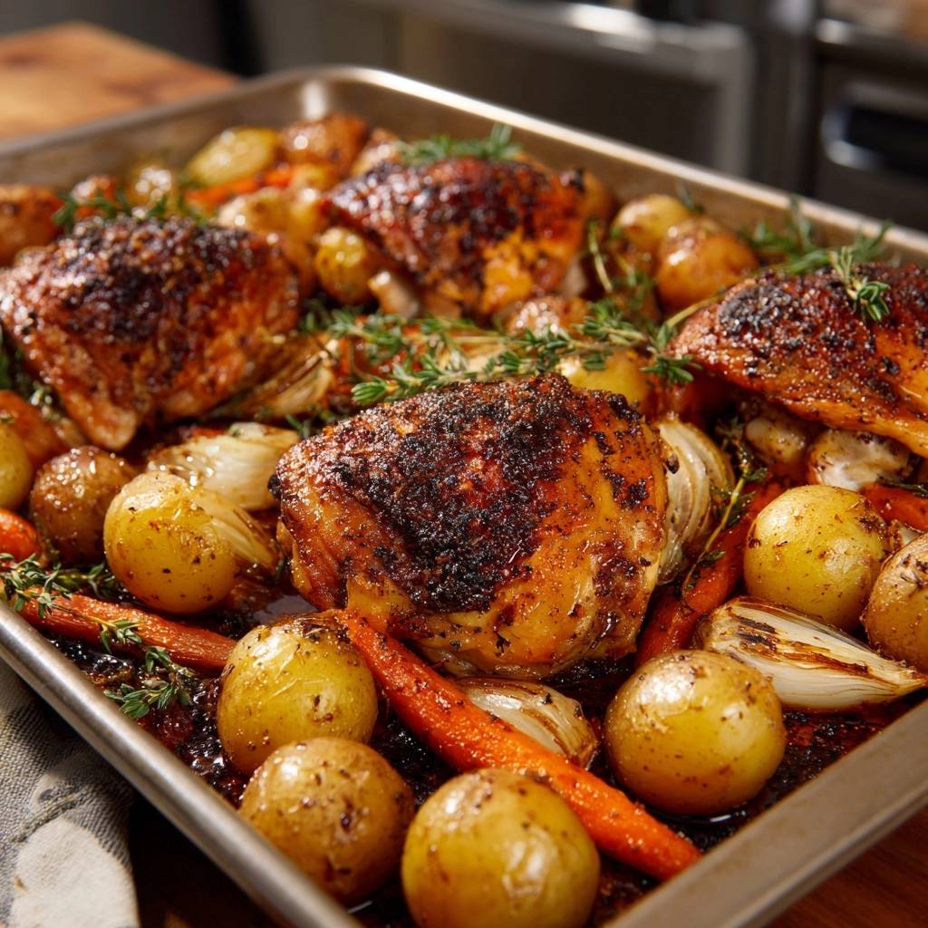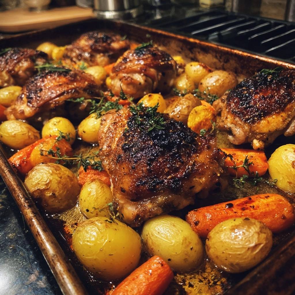 Knusprige Hähnchenschenkel mit Babykartoffeln und Karotten