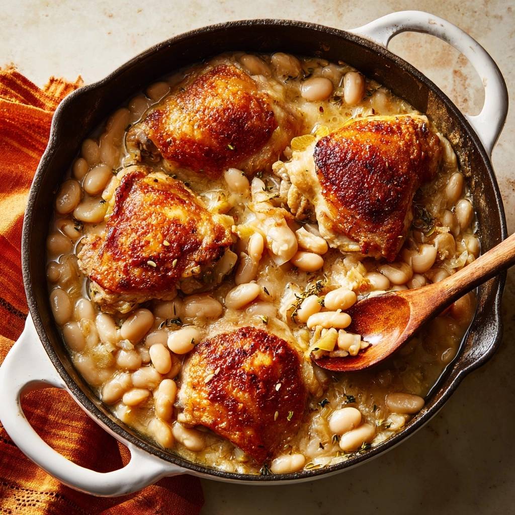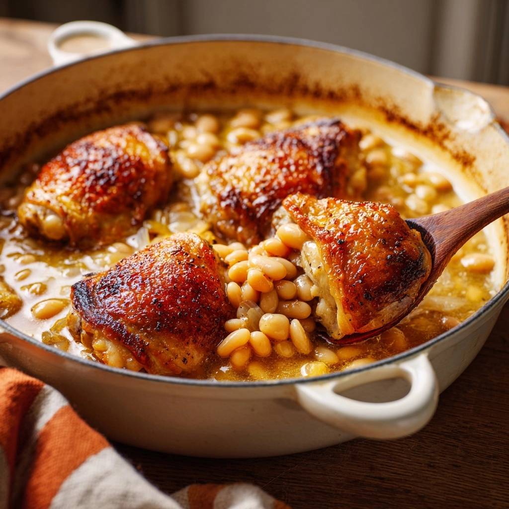 Stell dir vor, du beißt in die goldene, knusprige Haut eines Hähnchenschenkels, und darunter wartet saftiges Fleisch auf cremige weiße Bohnen. Der Duft von gerösteten Zwiebeln und Thymian zieht durch die Küche, und alles schmeckt so intensiv, als wär’s ein Festtagsessen.